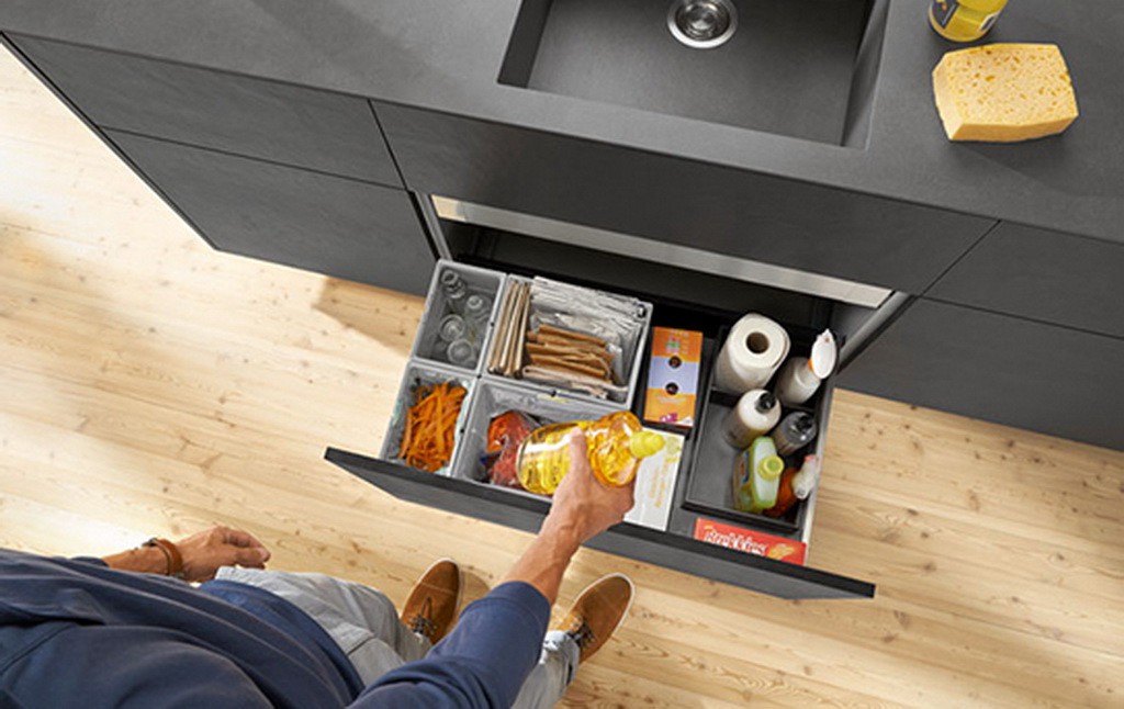 De volledig uittrekbare lade maakt het vullen, reinigen en legen van de vuilnisbakken heel eenvoudig, omdat deze comfortabel van boven en tot helemaal achteraan bereikbaar zijn. Praktische lade-indelingen zoals AMBIA-LINE of ORGA-LINE zorgen dat reinigingsmiddelen veilig blijven staan.