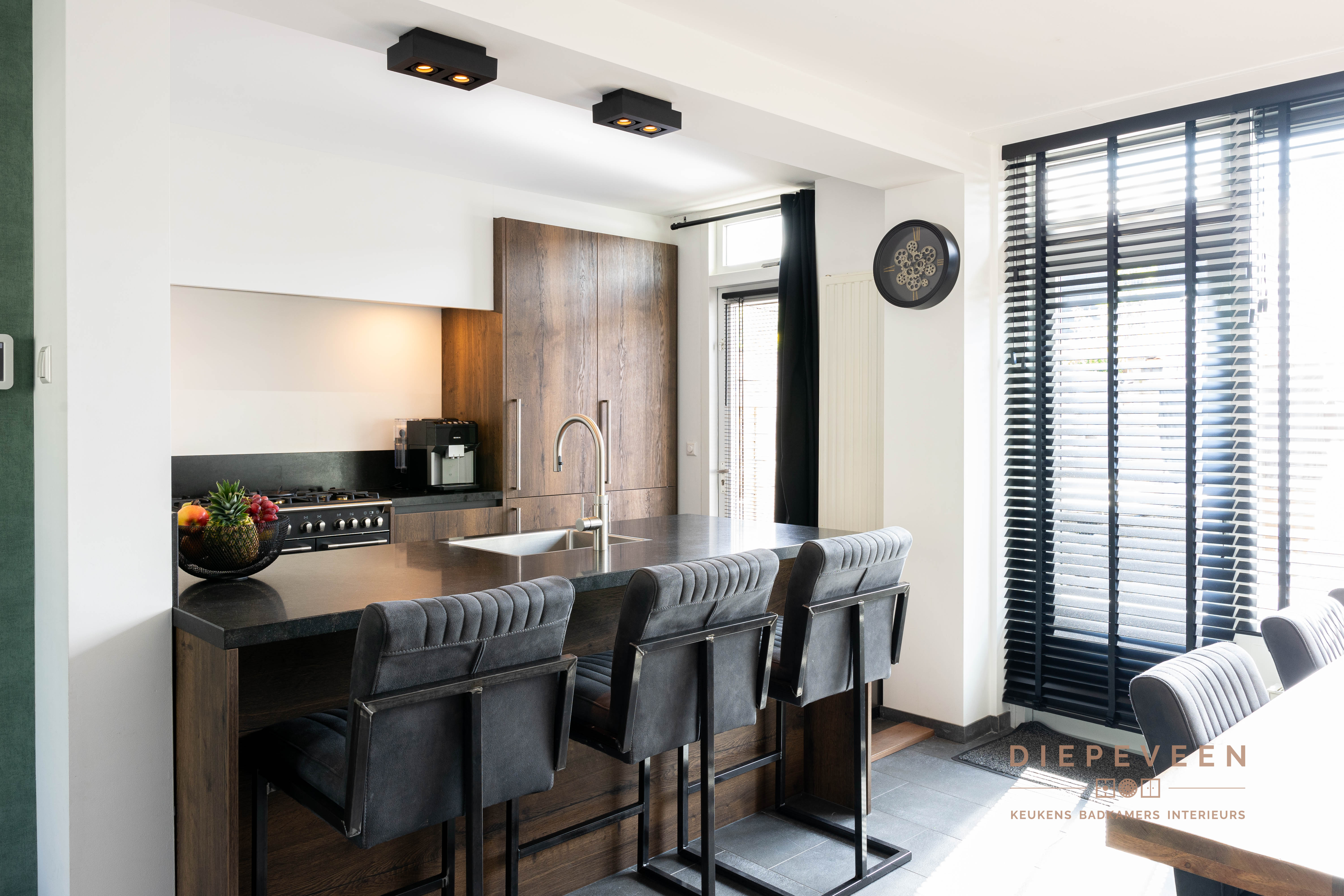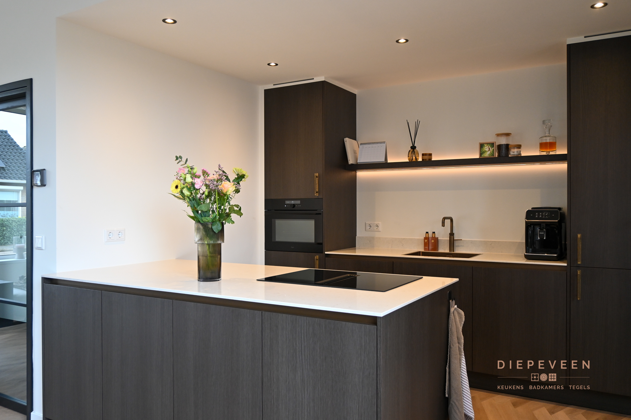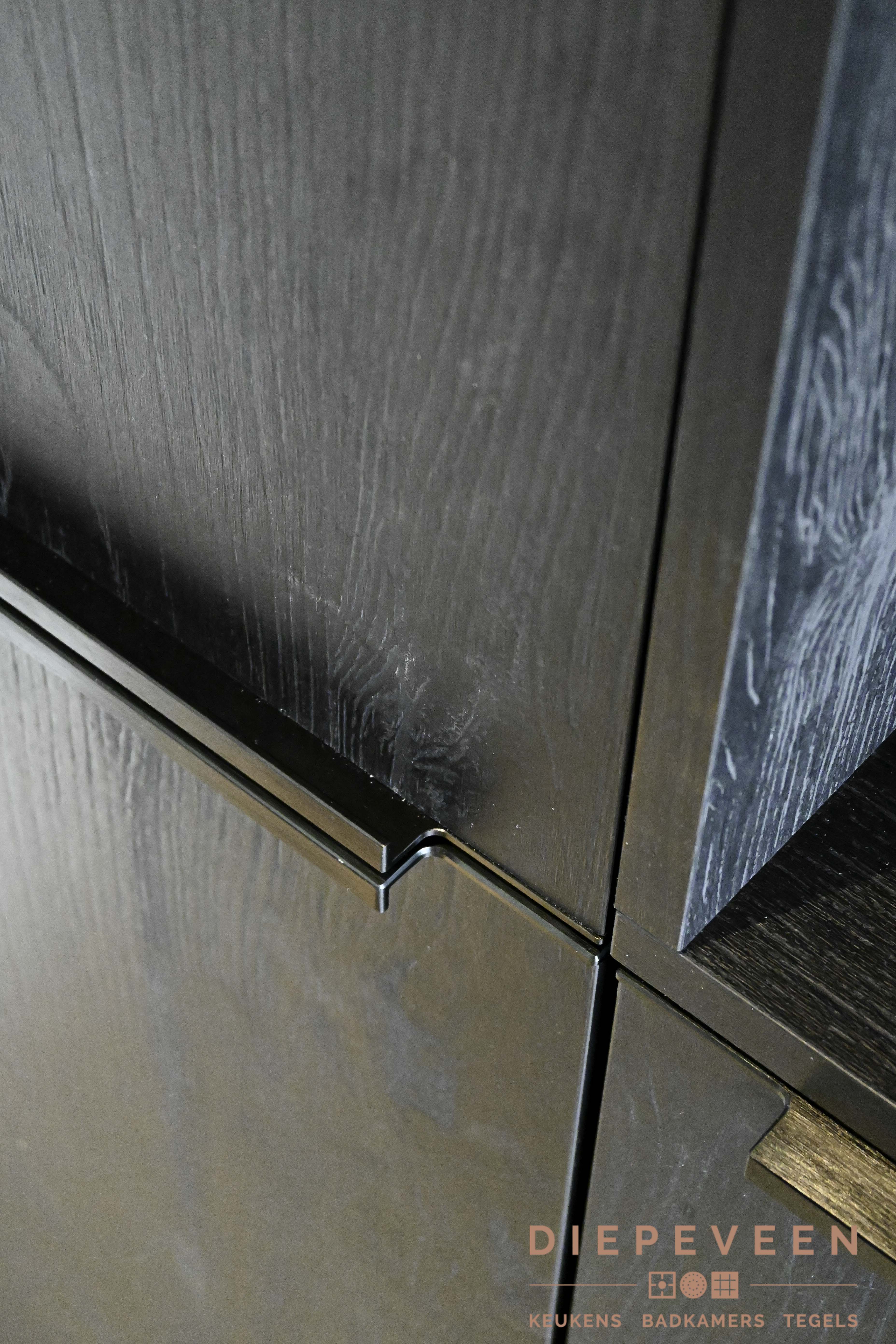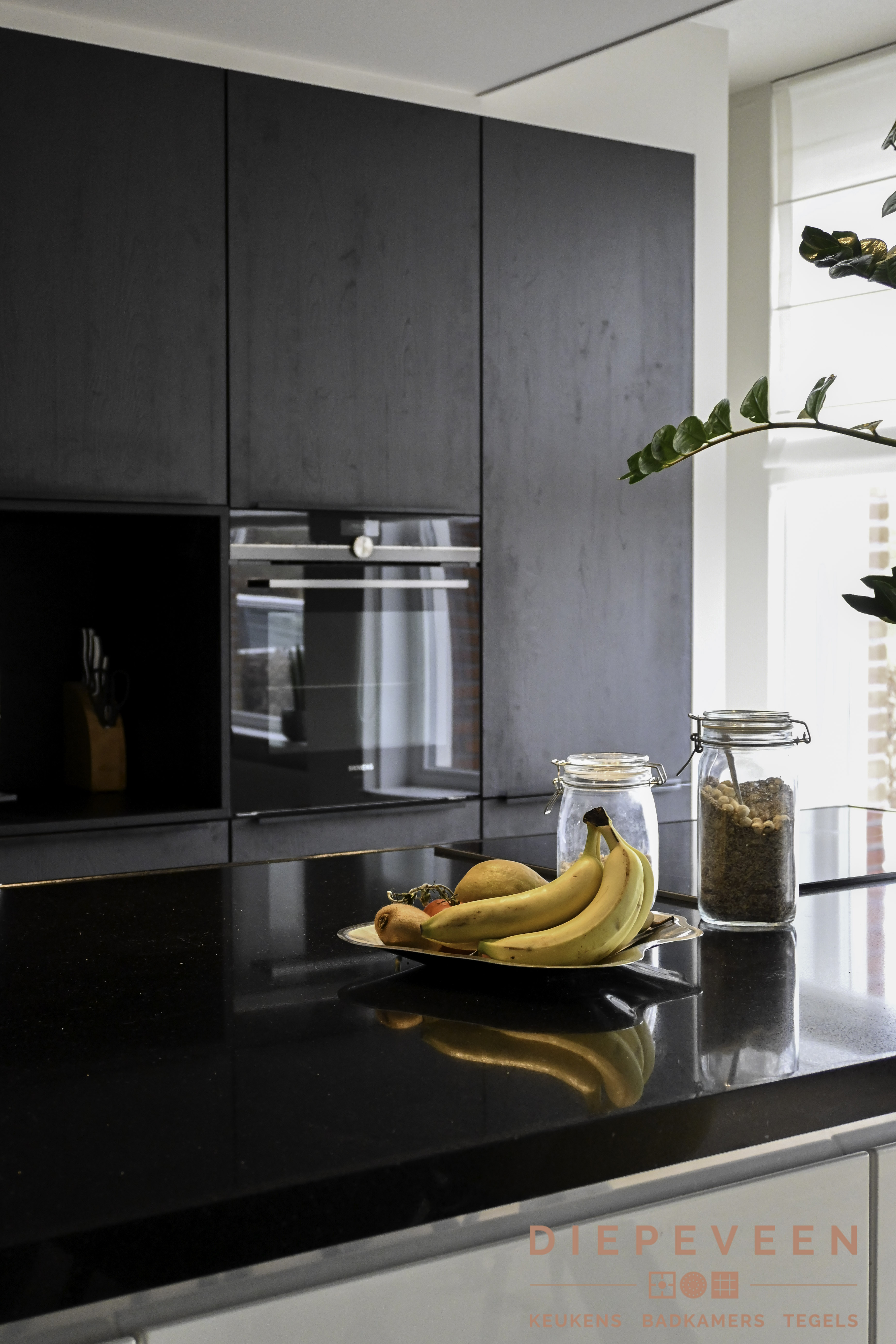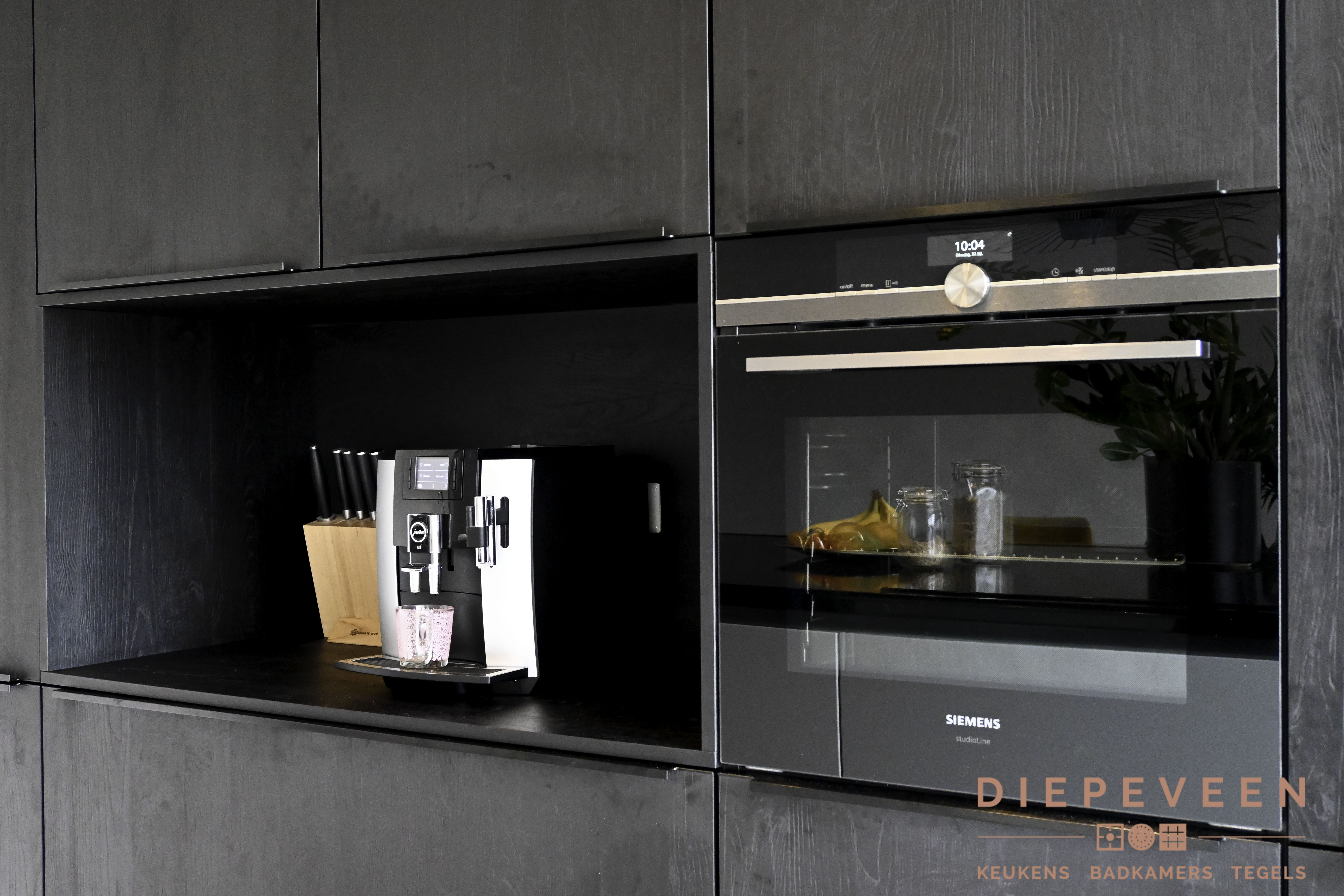 Zwarte kastenwand met ingebouwde multifunctionele oven met stoomfunctie. De nis creëert een mooie plek voor het koffieapparaat. De fronten zijn In houtlook zwart en combineren goed met het zwarte werkblad. De grepen zijn in moderne look.