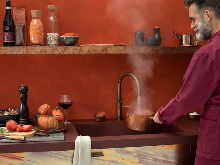 De mooie Fusion en de Classic Fusion Quooker-kranen in messing patina