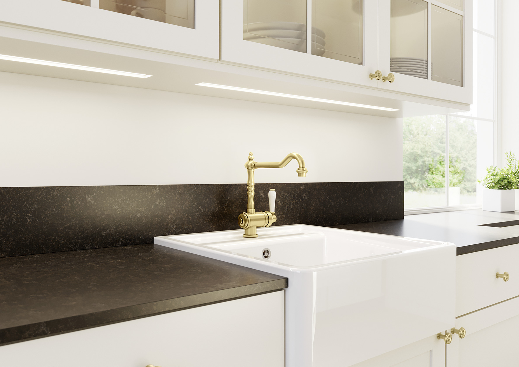 De keukenkranen in satin gold maken een indrukwekkende indruk in de klassieke landhuisstijl. De BLANCO TRADON mengkraan, bijvoorbeeld, ziet er zeer elegant, rustig en gecentreerd uit. De ideale partner aan zijn zijde is een hoogwaardige keramische spoelbak.