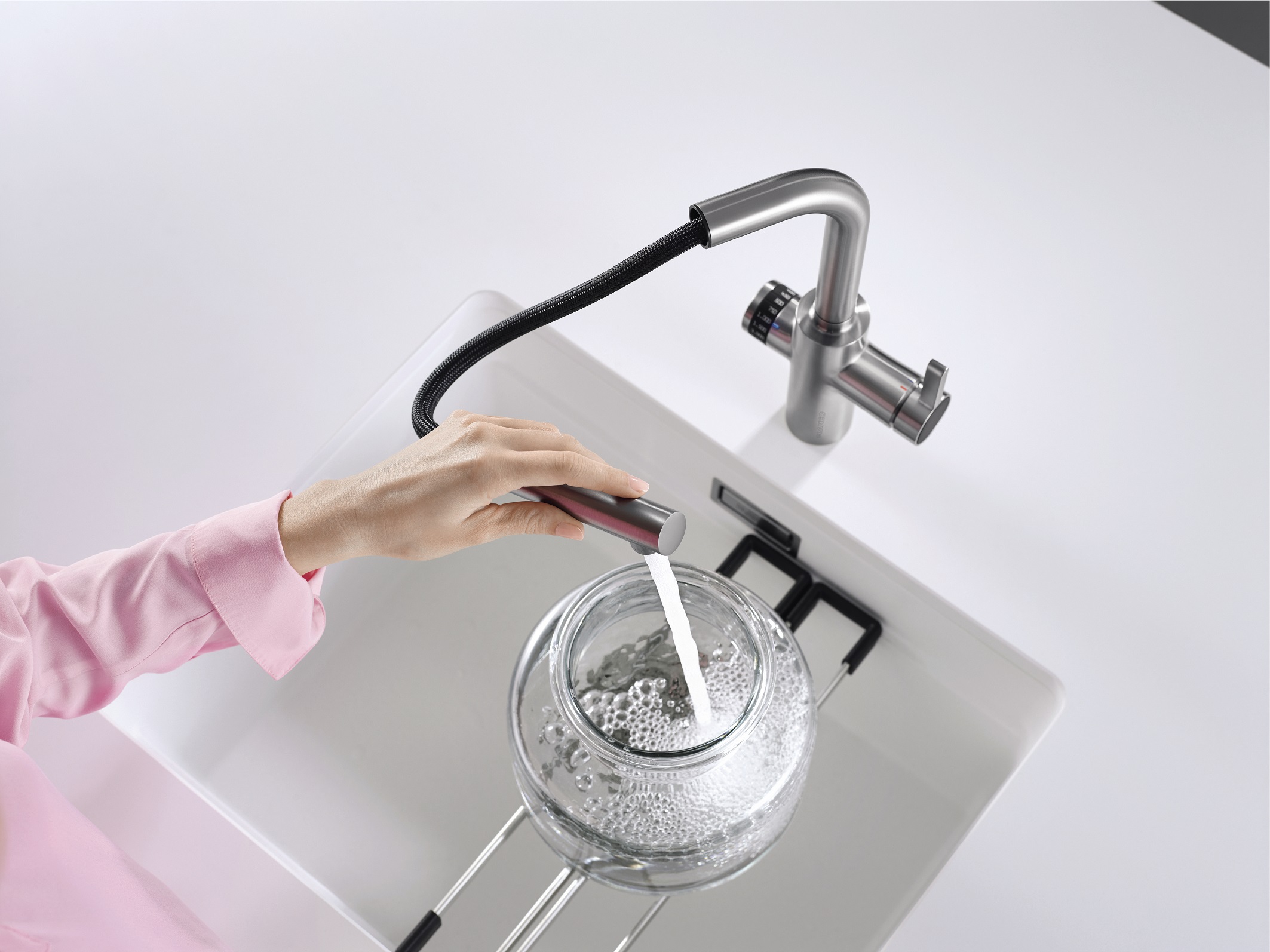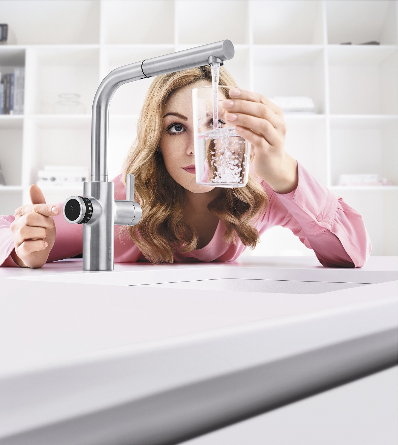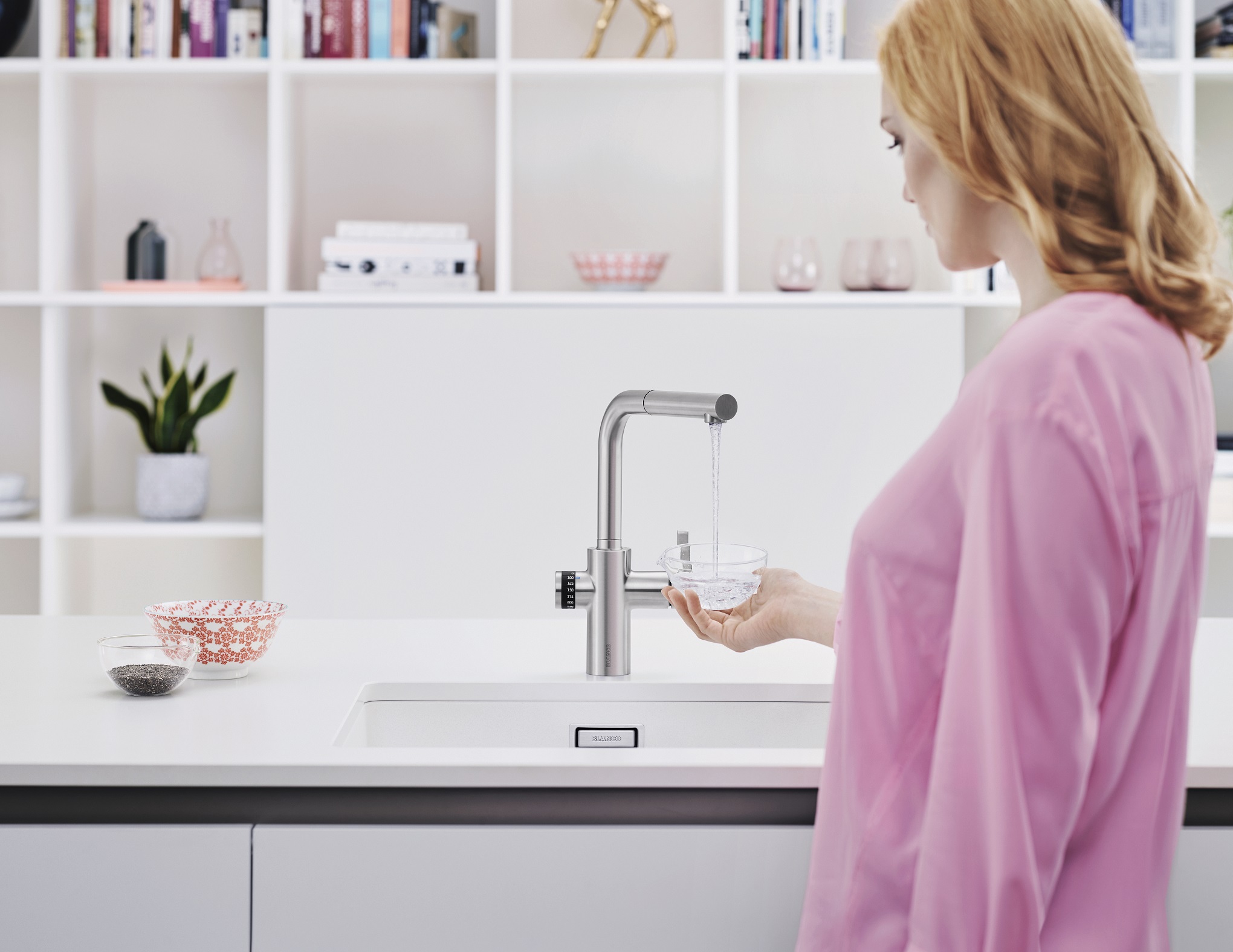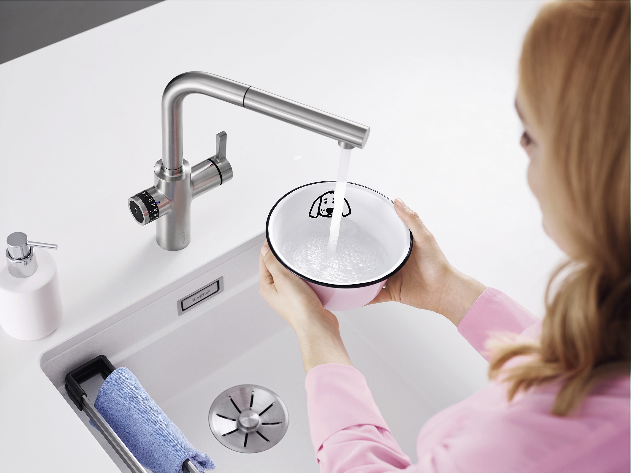 Altijd de juiste hoeveelheid water met de BLANCO EVOL-S Volume mengkraan. De nieuwe intelligente kraan van Blanco heeft een bijzondere maatbekerfunctie. De benodigde hoeveelheid water wordt eerst geselecteerd met behulp van een draaiknop. Vervolgens is het voldoende om deze draaiknop aan de zijkant aan te raken en BLANCO EVOL-S Volume levert de exacte hoeveelheid water die je wenst.