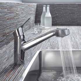 KLUDI TANGENTA is ook leverbaar met een uittrekbare uitloop. Doordat de lange slang het mogelijk maakt, dat de uitloop tientallen centimeters uit de kraan genomen wordt, nemen de gebruiksmogelijkheden ook exponentieel toe. De bak uitspoelen, een vaas of emmer vullen is in een handomdraai gebeurd.