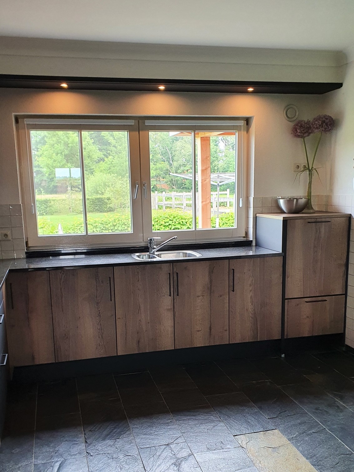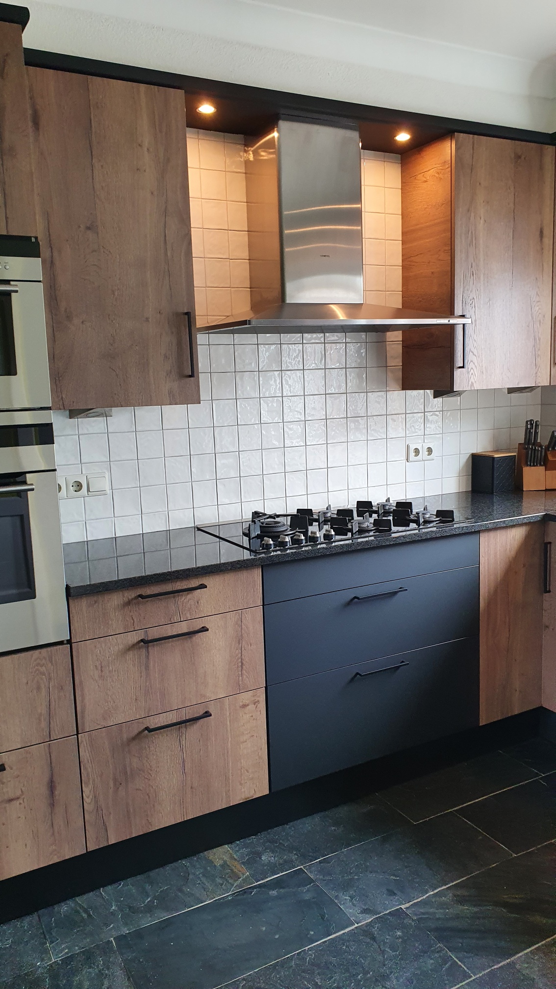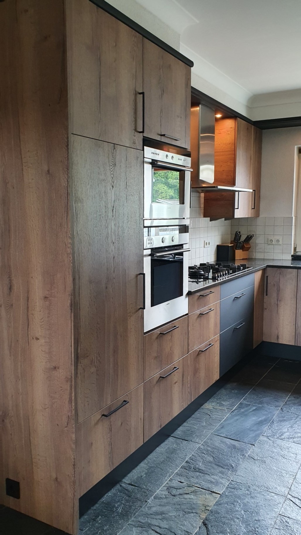 Deze keuken had roomwitte 'folie-fronten' die loslieten, en was hoognodig toe aan een opfrisbeurt. Een mooie kans om de keuken ook meteen een warmere uitstraling te geven en beter te laten matchen bij de natuurstenen vloer. In overleg met De Keukenvernieuwers gingen de bewoners voor gladde fronten in een combinatie van 'wild eiken' en 'carbon' (matzwart). Een mooi voorbeeld van synergie tussen materialen en kleuren. Door deze keukenrenovatie komt niet alleen de keuken, maar ook de vloer veel beter tot zijn recht.