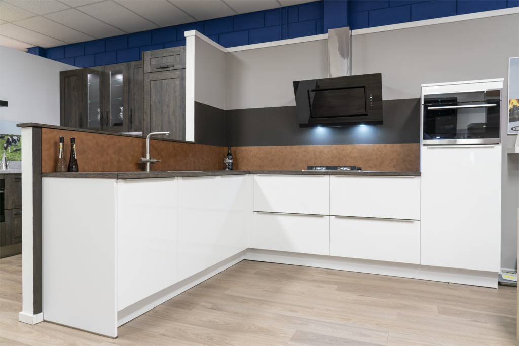 Bovenstaande hoekkeuken heeft naast de industriële look ook een moderne uitstraling. De witte kastjes zorgen voor de moderne feeling, terwijl het grijze strakke keukenblad zorgt voor de industriële sfeer. De keuken bevat een fornuis, koeler, kraan, vaatwasser en een bakoven met magnetronfunctie.