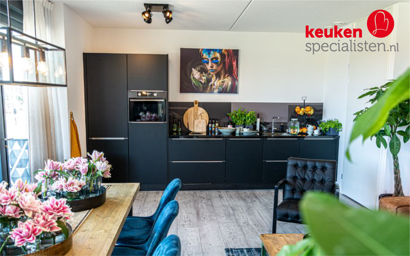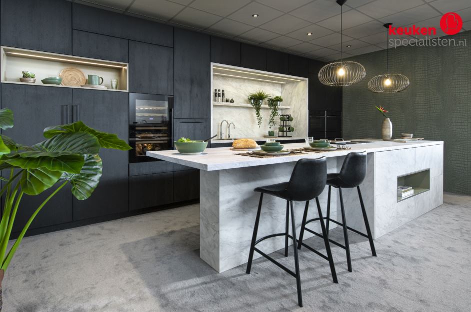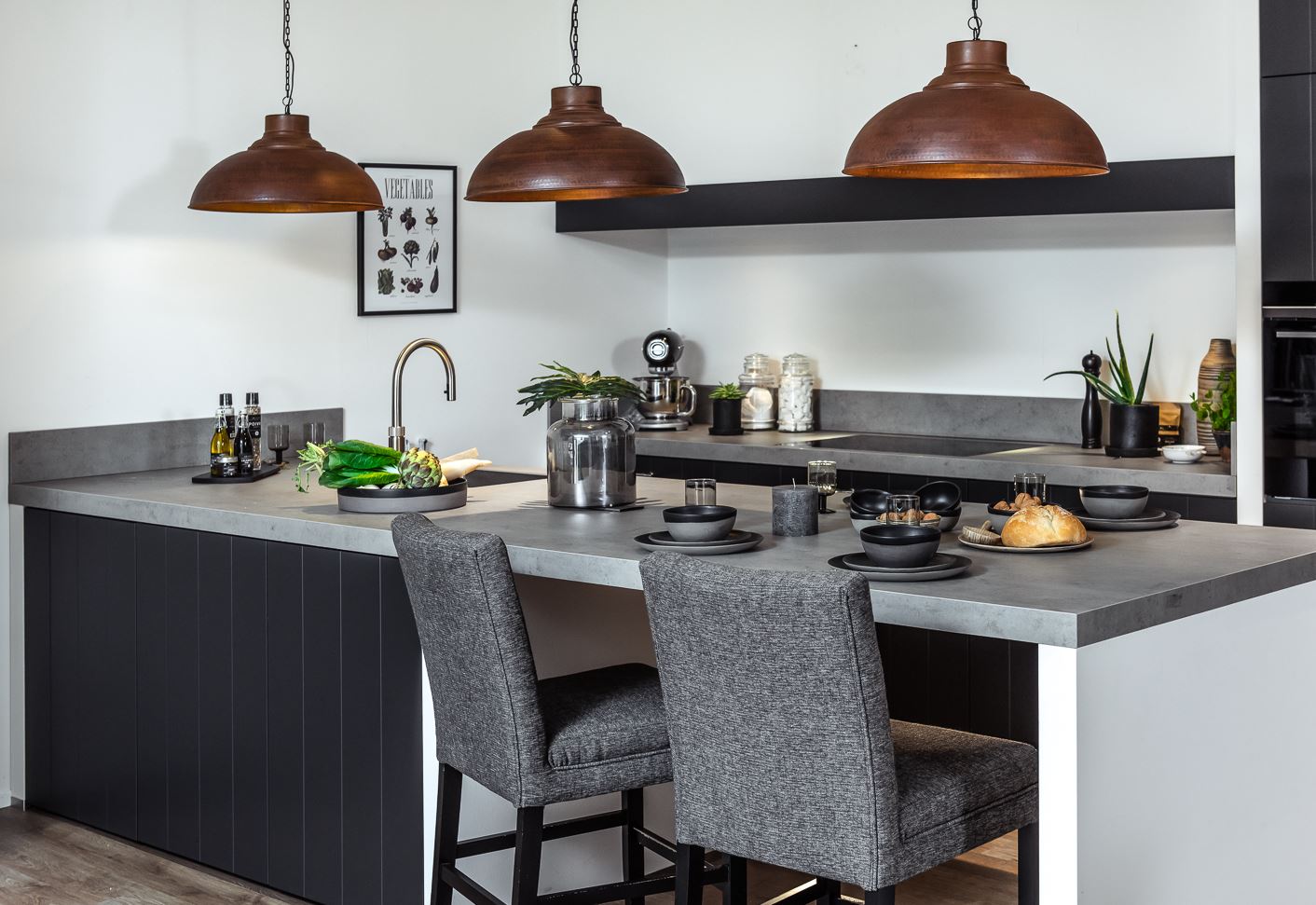 Kies voor een type keuken die goed bij je woonstijl en het huis past. Hier is gekozen voor een industriële keuken in een donkere kleur met een stoer blad van betonlook. Het keukeneiland is licht, wat zorgt voor een mooi contrast. De kleuren zijn basic dus tijdloos: ideaal om sfeer te brengen in de styling. Het voordeel van de neutrale keuken is dat je na verloop van tijd de stijl kunt veranderen door de styling.
