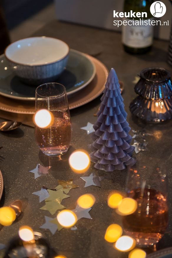 Tijdens de feestdagen kies ik voor wat extra luxe voor het kerstdiner in de keuken. Het servies stapel ik van groot naar klein op een chique onderbord, het bestek heeft dezelfde, warme kleur. Op tafel zet ik wat extra kaarsen en leg ik glanzende sterren neer, dat staat meteen heel feestelijk!