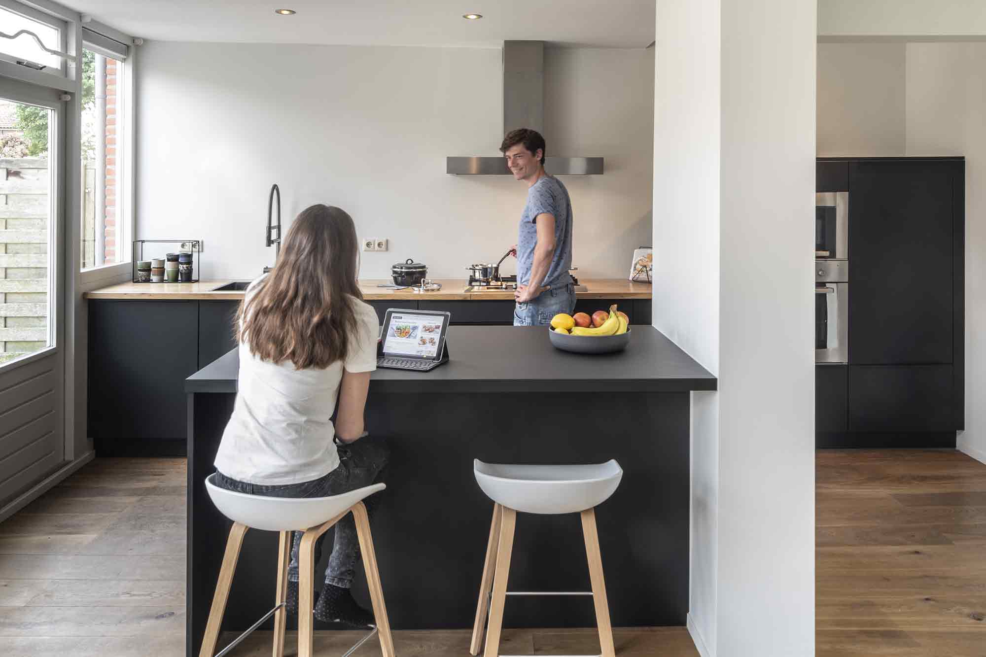 Dan is het zaak om de Keukenvernieuwers in te schakelen. In korte tijd werd de oude, grijze keuken omgetoverd tot een strakke, moderne kookwerkplaats met bijpassende 'keukenbar'. De keukenapparatuur was nog goed, daar werd niets aan veranderd. Het oude, massief houten werkblad werd geschuurd en in de olie gezet, niets mis mee! Wel werden spoelbak en kraan in dit geval vervangen. Voor De Keukenvernieuwers een relatief overzichtelijke klus, maar de sfeer in de keuken werd er wel enorm mee verbeterd. Dat vonden ook de nu zeer trotse gebruikers van de keuken.