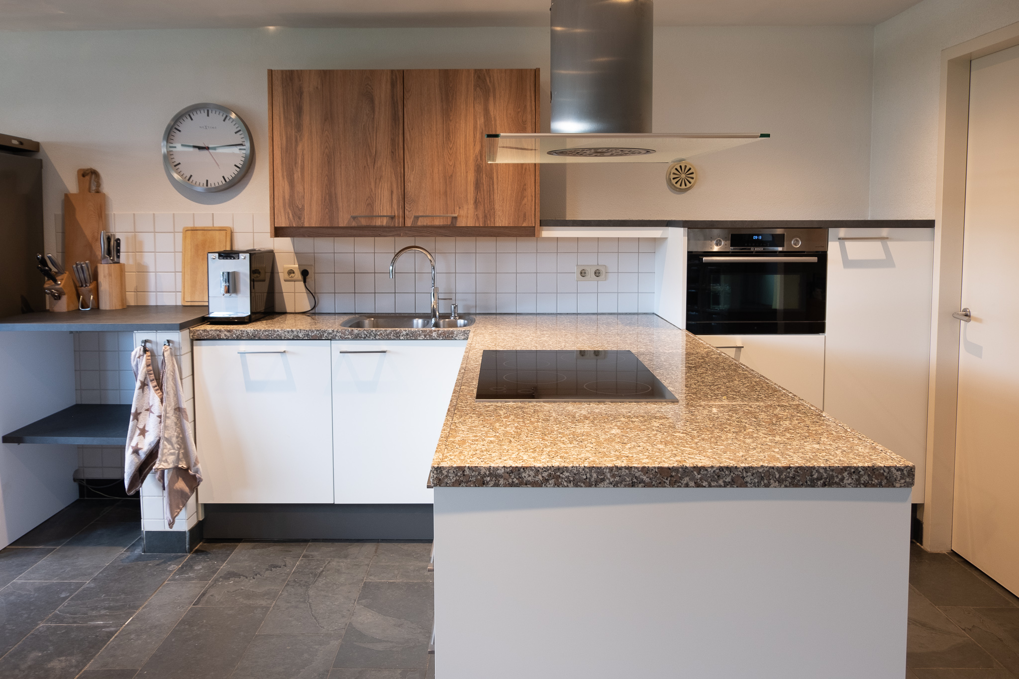 De klant wilde graag een strakke en frisse uitstraling, met behoud van het granieten aanrechtblad. Er werd gekozen voor wit in combinatie met houtlook en antraciet. Een frisse kleurcombinatie die het bestaande keukenblad extra mooi tot zijn recht laat komen. Ook de grepen werden vervangen door een modernere variant en allemaal horizontaal geplaatst voor een extra strakke look.