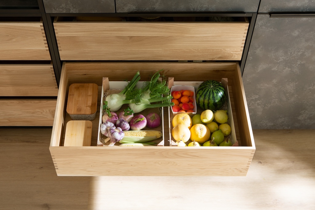 Zo zijn er de verwijderbare boxen in de Woodtrend-reeks van Mobalpa – van eikenhout of notelaar – om de keukenlades te organiseren. Deze hoogwaardige houten verhogingen zorgen voor maximale opbergmogelijkheden én voor een verfijnde look. Een mooi voorbeeld van hoe esthetiek en functionaliteit hand in hand gaan.