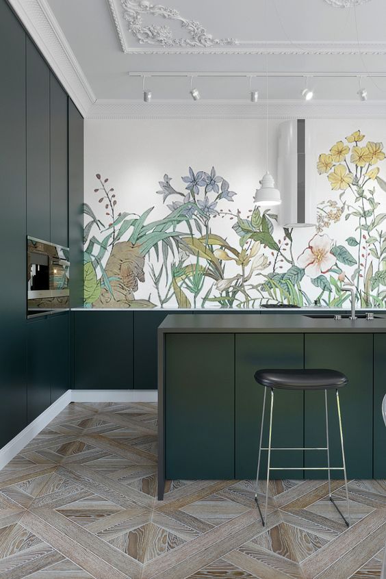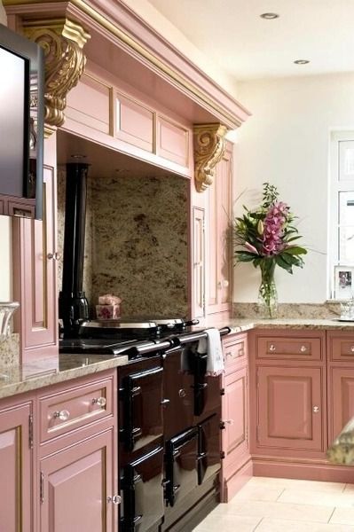 Een keuken in deze stijl doet het goed in zowel de kleur groen als roze.