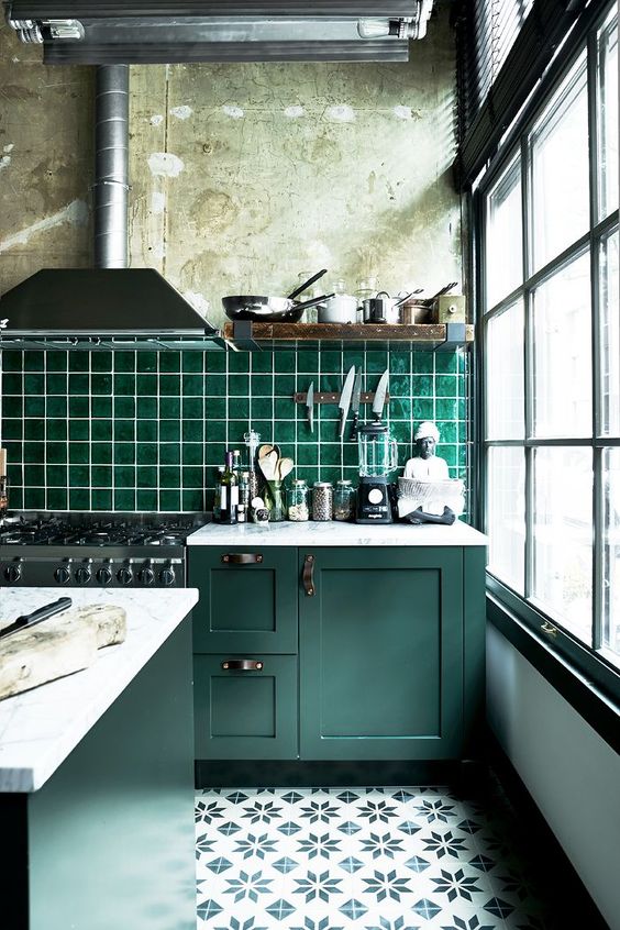 Deze keuken heeft vaak donkere tinten en je ziet veel koude materialen zoals beton en metaal dat wordt gecombineerd met robuuste elementen, zoals houten planken, zware grepen en donkere tegels of glas. Vooral groen kleurt goed in een industriële keuken, maar ook roze kan een leuk kleuraccent zijn in deze stijl.