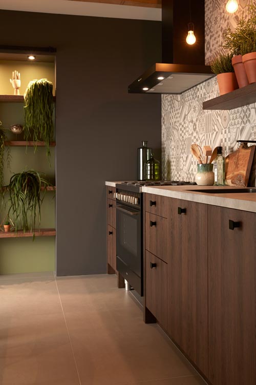 Haal buiten naar binnen. Warm hout en veel groen geven deze keuken een haast exotische sfeer. De tegeltjes op de achterwand versterken dit effect. Het matzwarte fornuis, de afzuigschouw en de lamp voegen een industriële touch toe.