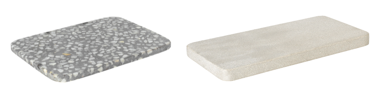 Als tegenhanger voor het donkerbruine kurk heeft blomus ervoor gekozen onder de naam Omeo een serie dienbladen te ontwerpen die zijn gemaakt van zandsteen en terrazzo. Deze steensoorten zijn gekozen vanwege het mooie spel van licht en schaduw als ze worden gebruikt om bijvoorbeeld olie, azijn en kruiden op te presenteren. Zandsteen is vrij licht en verfijnd van kleur, terwijl terrazzo, met de uitstraling van marmer in combinaties van wit, grijs en zwart, meer op de voorgrond aanwezig is. Beide materialen zijn robuuste steensoorten die gebruikt kunnen worden als onderzetter voor een kandelaar, als onderbord, of als basis voor een verzameling blikvangers op tafel.