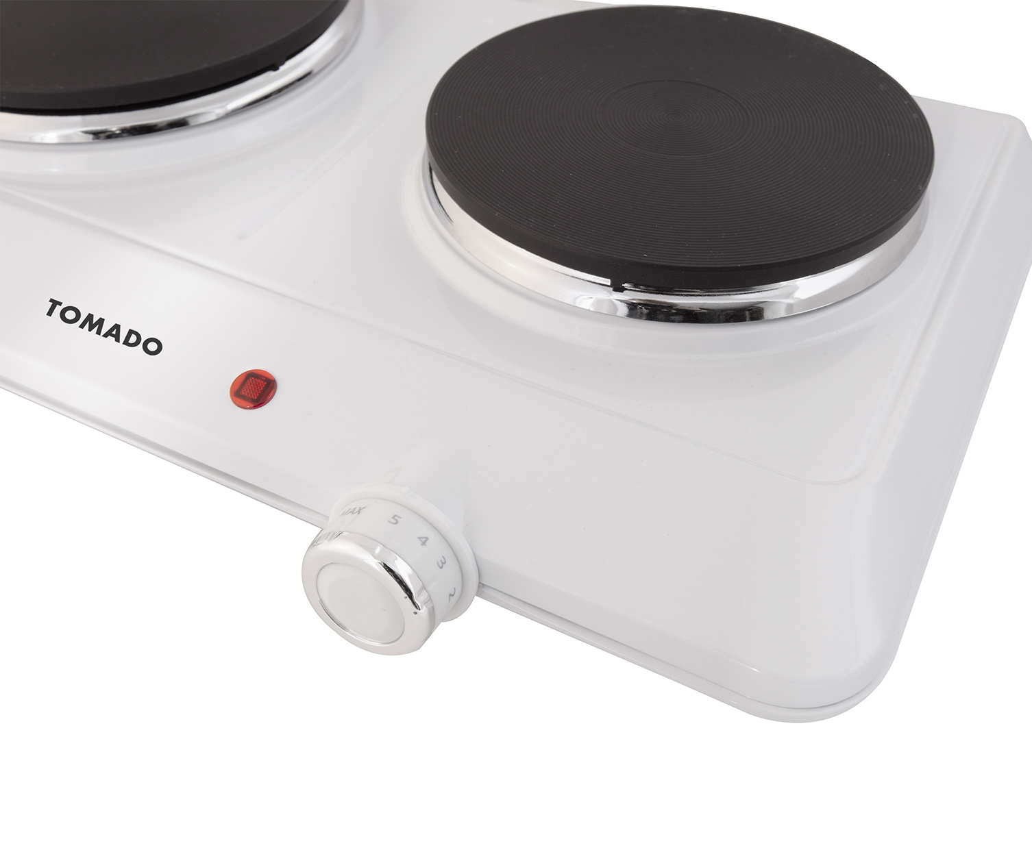 Deze 2-pits elektrokookplaat van Tomado is de perfecte oplossing voor op vakantie, in een studentenkamer of in een buitenkeuken. De duurzame gietijzeren kookzones hebben een kookoppervlak van Ø180 en Ø150 mm en 2 regelbare knoppen met indicatielampjes, zo weet je precies wanneer de kookplaat aan of uit staat. De kookplaat staat stevig op het aanrecht dankzij de 4 antislipvoetjes en is geschikt voor grote en kleine pannen. Een kookplaat die multi-inzetbaar is, hoe fijn is dat!