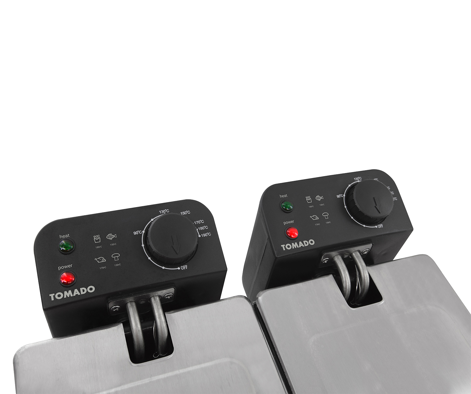 Met deze dubbele koude zone friteuse TDF6001S van Tomado bak je allerlei gerechten, van smaakvolle frites en kroketten tot aan krokante kipkluifjes. De friteuse heeft een maximale capaciteit van 6 liter verdeeld over 2 pannen en kan eenvoudig ingesteld worden tot 190°C dankzij de praktische draaiknop. De twee losse frituurpannen zijn ideaal wanneer je meerdere snacks en frites tegelijkertijd wilt bakken. Frituren met een koude zone is direct een stuk gezonder omdat de olie langer vers blijft in de pan. Het verwarmingselement hangt direct in de olie, waardoor je maaltijd ook nog eens lekker knapperig wordt! De friteuse is na gebruik eenvoudig schoon te maken en heeft vaatwasbestendige onderdelen.