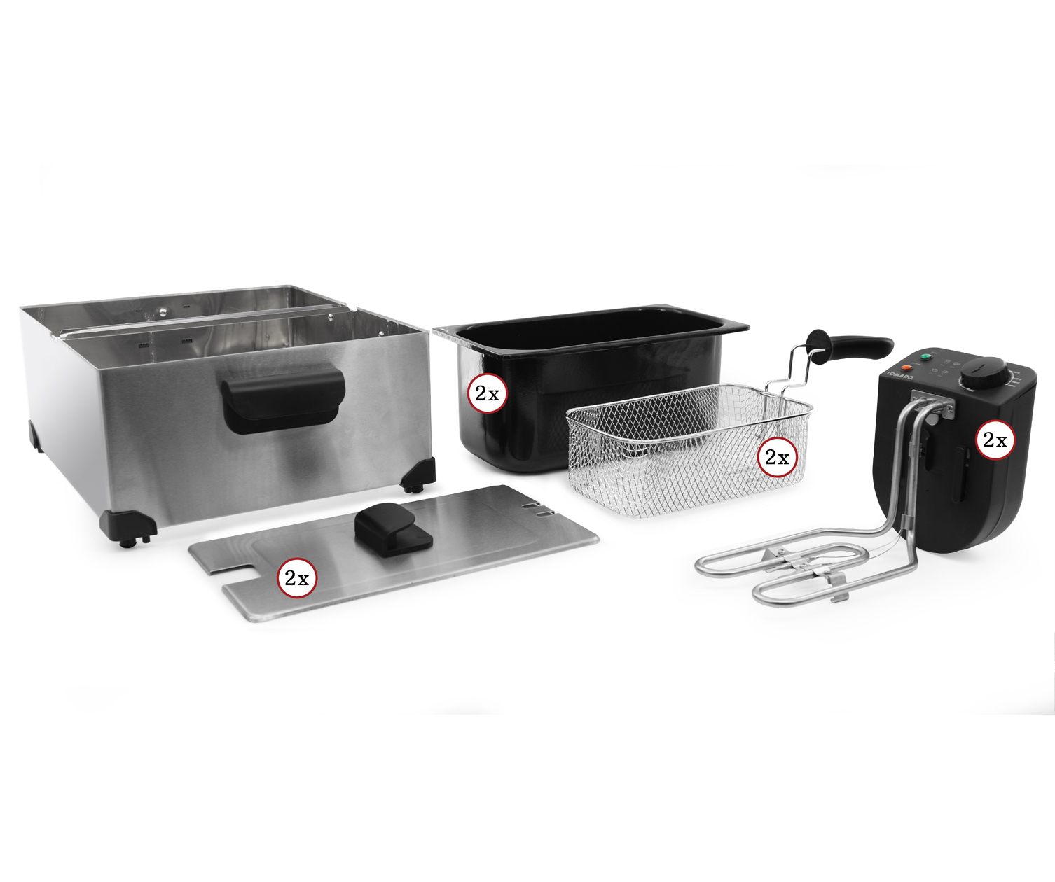 Deze friteuse heeft een zeer ruime inhoud van 2 x 3 liter waarmee de frituurpan uitermate geschikt is om bijvoorbeeld frites en snacks tegelijkertijd kunt bakken. Doordat het vet in beide pannen gescheiden is zal het langer vers blijven. Ook heb je daardoor geen geur- en smaakoverdracht.