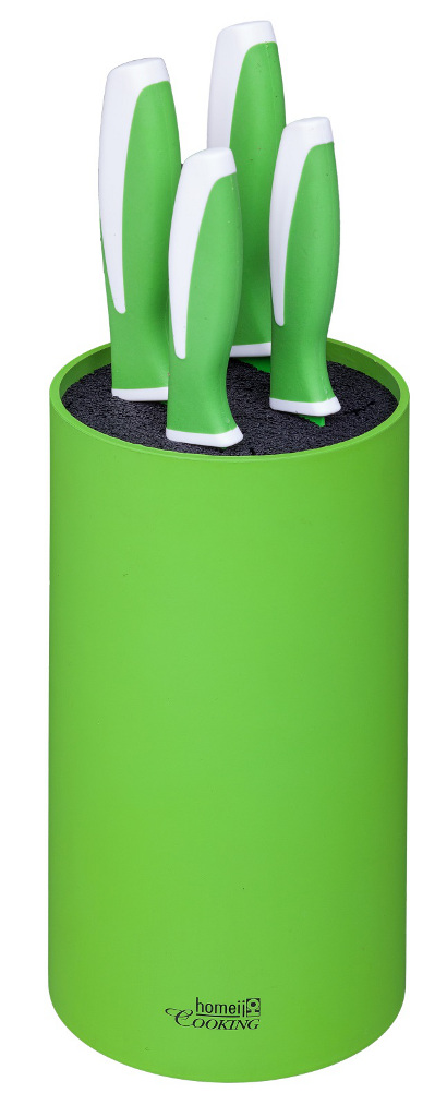 De Homeij Cooking Verde messenhouder is vervaardigd van groene PP kunststof met een uitneembare en wasbare borstel. De messen zijn vervaardigd van gelegeerd roestvrij staal met een voedselveilige antikleefcoating. Het ergonomisch vormgegeven heft is vervaardigd van 2 componenten met een basis van sterk en hard PP, overtrokken met soft antislip rubber. De Homeij Cooking Verde messen zijn extra licht en belasten de pols niet.