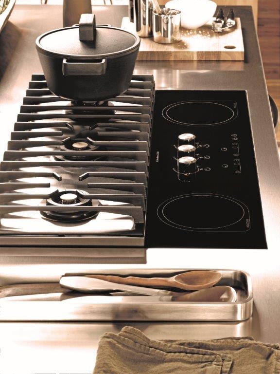 Deze Step kookplaat bevat een dubbele kooktechnologie: gas en inductie. De kookplaat is uitgerust met 3 gasbranders met twee vlamringen van elk 4,2 kW, een wokadapter, snelle ontsteking, veiligheidskleppen, doorlopende solide gietijzeren pannendrager en twee inductieplaten van elk 1,8 kW. Hij is niet alleen uitgerust met speciale functies (warmhouden, booster, timer) maar ook met een restwarmte-indicator, een plaatje voor elke vlamring en automatische uitschakeling. Tot slot biedt de Step kookplaat ook beveiligingsfuncties voor kinderen en automatische uitschakeling.
