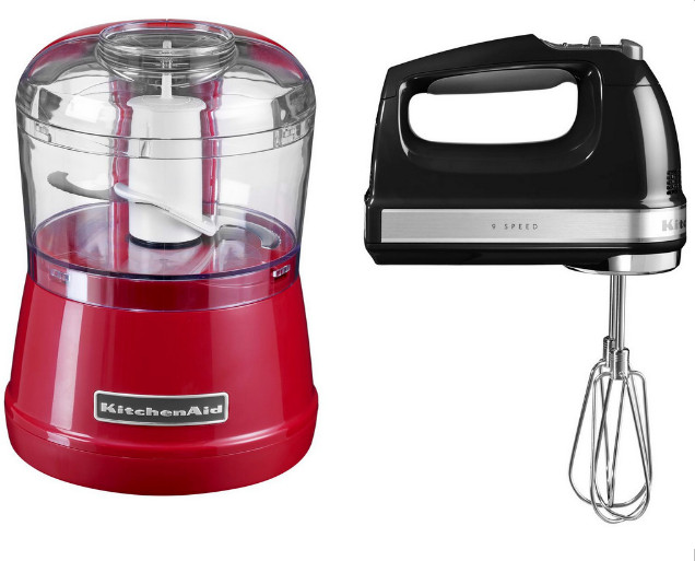 Compacte KitchenAid Chopper voor het hakken en mengen en retro KitchenAid Handmixer voor het mixen en kloppen.