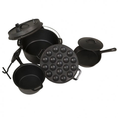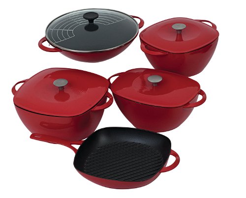 De Culinarioncollectie bestaat uit een gietijzeren grill/braadpan, 28 x 28 cm, een rechthoekige kookpotten met een doorsnede van 28 cm en twee vierkante kookpotten van 28 en 24 cm.