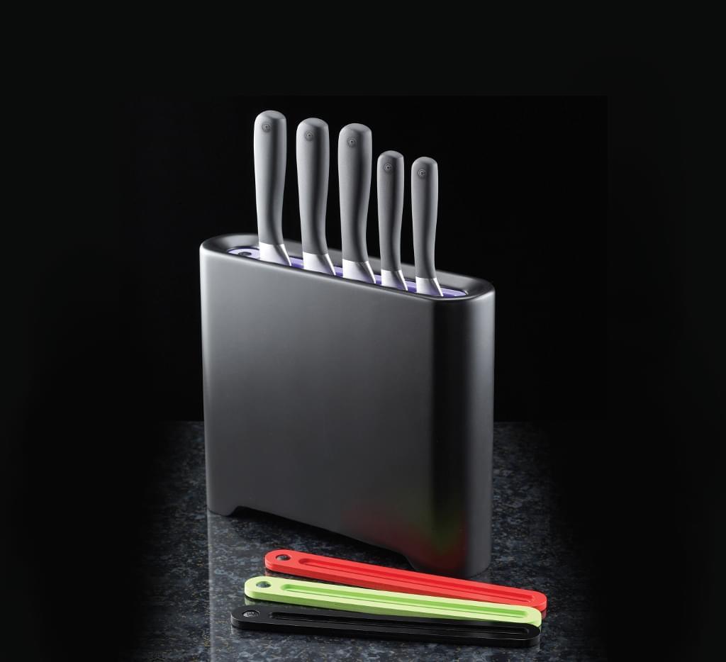 Kleur in de keuken. Gripi speelt in op die tendens en zet een trendy messenblok neer als eyeopener. Zwarte blokken, felle tintjes.