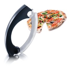 Geheim van deze Pizza Slicer is de vorm. Handvat en mes zijn zo gemaakt dat bij het snijden automatisch het lichaamsgewicht meehelpt. Tijdens gebruik wordt automatisch op het mes gesteund. Kracht zetten is dus niet meer nodig. En doordat het mes een lichte boogvorm heeft is de Pizza Slicer tegelijk de ideale kruidenhakker. Een licht wiegende beweging maken en alle kruiden, uien en knoflook worden razendsnel fijn gehakt en gesnipperd. Groots in gebruik is de Pizza Slicer klein op te vouwen in de keukenla, het mes wordt daarbij ingeklapt zodat klein ook veilig is.