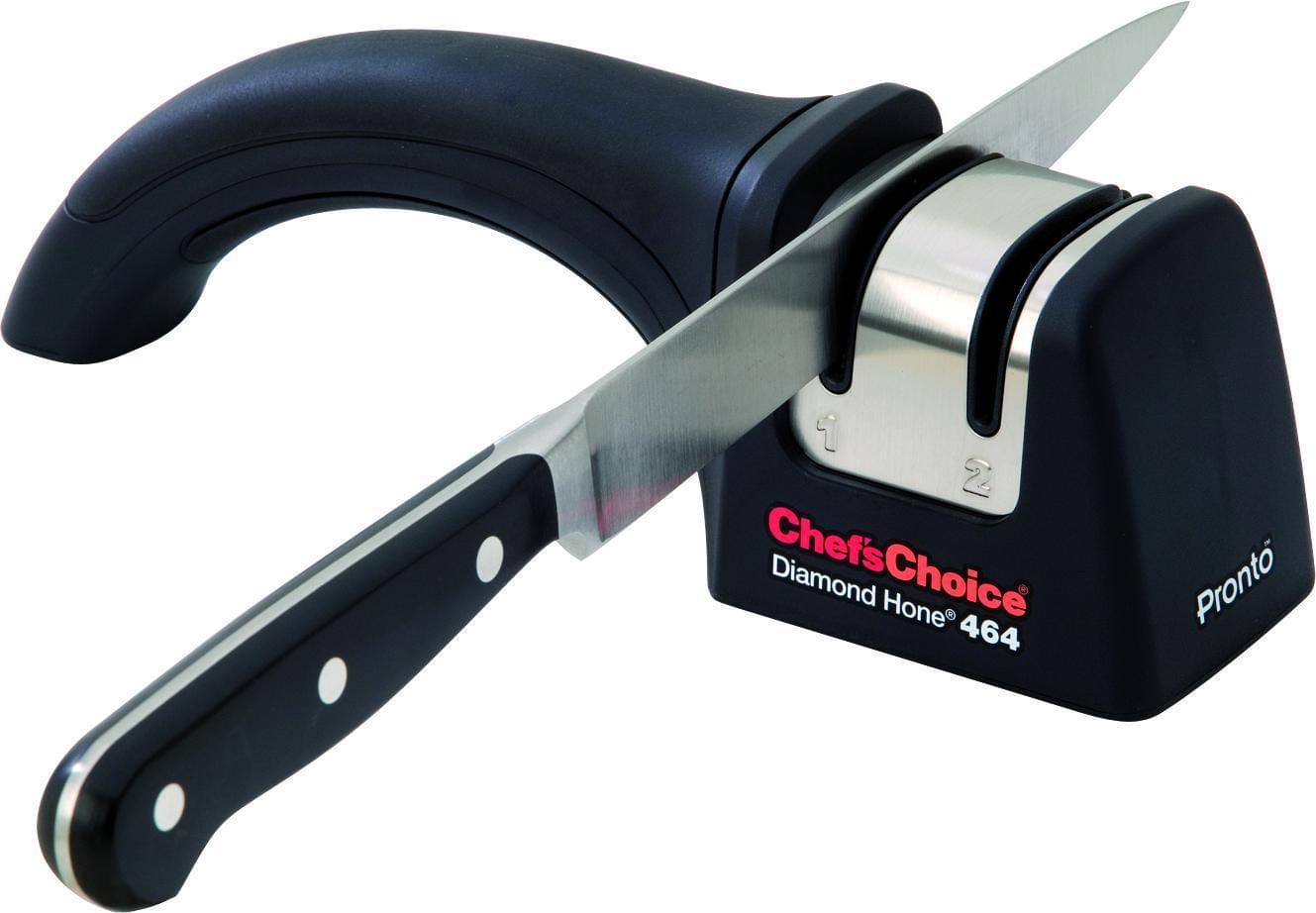 De Pronto CC464 messenslijper van Chef?sChoice U.S.A. is ontworpen om binnen enkele seconden zowel messen met een glad als een gekarteld lemmet te slijpen.