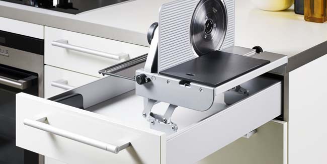 Deze universele snijder maakt zijn naam waar – hij snijdt alles. Niet alleen brood, fruit en groenten, maar alle soorten levensmiddelen. Poggenpohl’s universele snijder is een echte allrounder die kan worden geïntegreerd in het ladensysteem. Wanneer je de snijder nodig hebt, trek je gewoon de lade open. Ben je klaar, dan gaat de lade met de snijder erin weer dicht. Dus geen extra ‘sta in de weg’ op het werkblad.