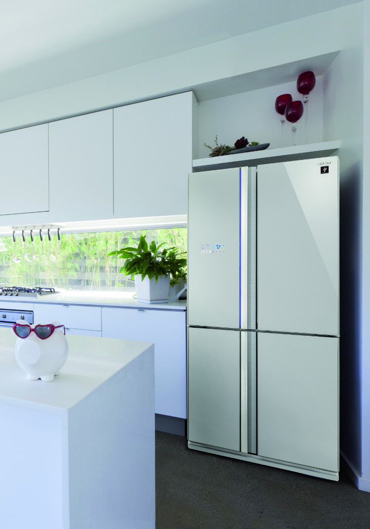 Dit model behoort tot de grootste vierdeurskoelkasten op de consumentenmarkt en beschikt over het uiterst energiezuinige A++-label. De koelkast is ontworpen voor moderne design-keukens en maakt gebruik van Sharp's antibacteriële Plasmacluster-technologie en hybride koeling om het voedsel langer vers te houden.