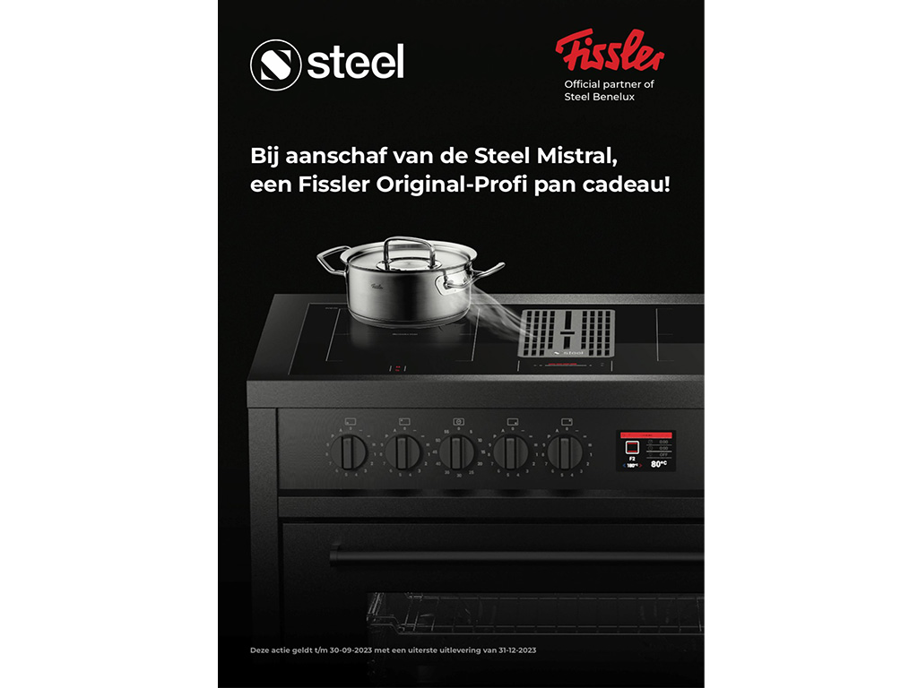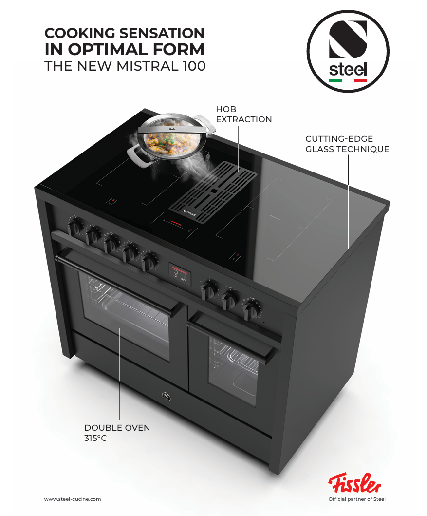 Vorig jaar met grote trom voorgesteld als dé nieuwkomer bij uitstek tijdens Eurocucina in Milaan, vandaag nog steeds een populair en fel gesmaakt fornuis. We hebben het over de Mistral van de Italiaanse fabrikant Steel Cucine. “Het eerste fornuis dat een oven, inductiekookveld en kookveldafzuiging in één toestel samenbrengt én daar bovendien een designtopper van maakt”, aldus Christian Borsboom van Steel Benelux. Een samenwerking met het Duitse Fissler zet de kwaliteit van de Mistral extra in de verf.