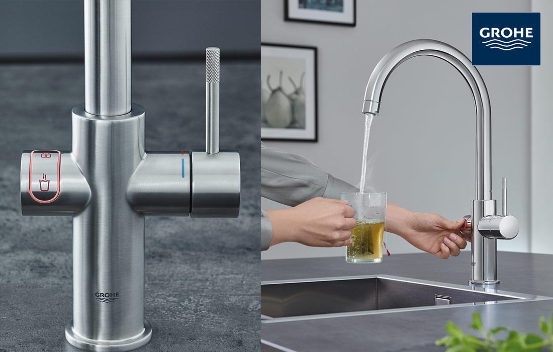 GROHE Red: GROHE biedt een titanium boiler aan die wordt geplaatst in het keukenkastje. Hierdoor komt er direct kokend water uit de kraan. Op de kraan zit een knop bevestigd waar een slotje op staat afgebeeld. Dit is een slot die ontworpen is voor kinderen, zodat ze de kraan niet kunnen openen. De kraan is te koop vanaf € 700,-.