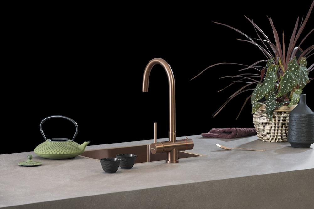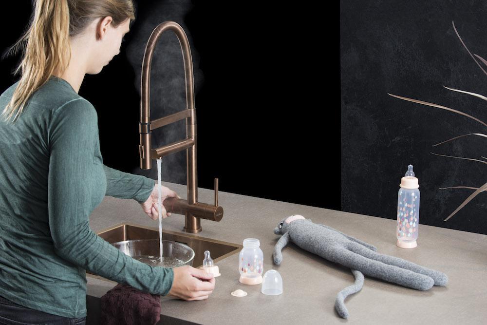 Selsiuz XL Copper: Selsiuz heeft ook een XL-versie van de kokend-water-kraan uitgebracht. Op de kraan zit een spoeldouche waarmee je gemakkelijk de spoelbak schoon kunt maken. Door de omstelknop is het mogelijk om te schakelen tussen een normale waterstraal of een douchestraal. De XL Copper is te koop vanaf € 1.149,-.