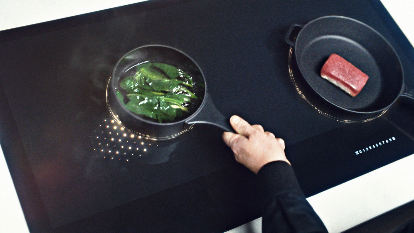 De nieuwe inductiekookplaat van Miele is flexibeler dan ooit. Ieder stukje kookplaat kan benut worden; links, rechts, midden, voor of achter. Het maakt niet uit waar de pan op de kookplaat staat, op ieder stukje kookplaat kan gekookt worden. Verplaats de pan waar jij wil koken en de bediening beweegt automatisch mee.