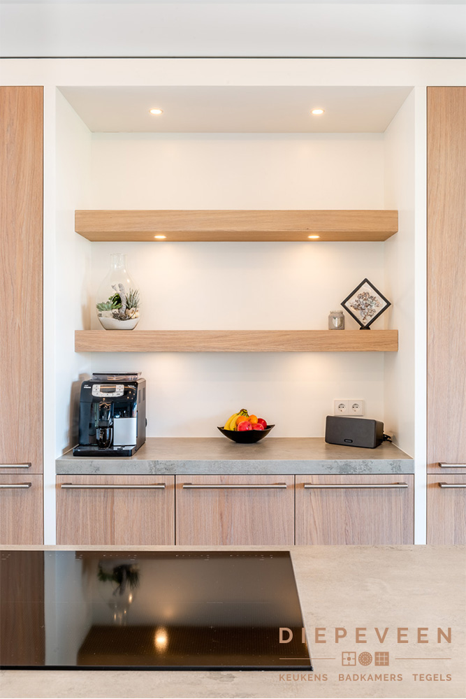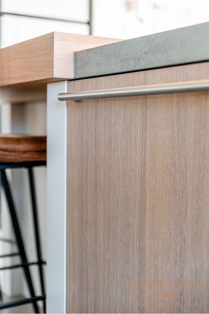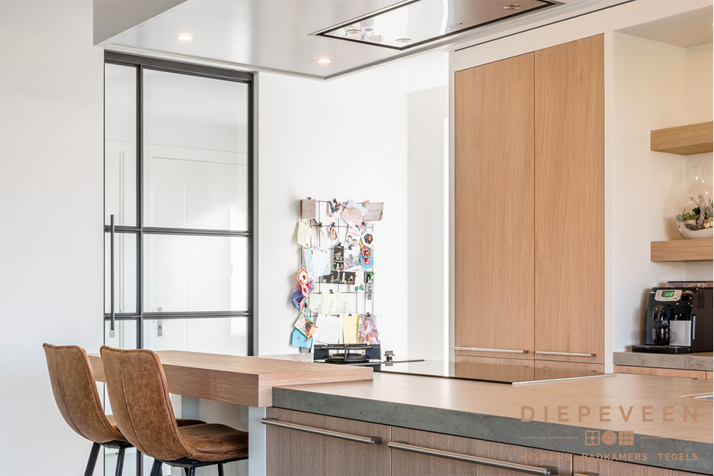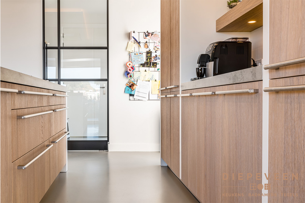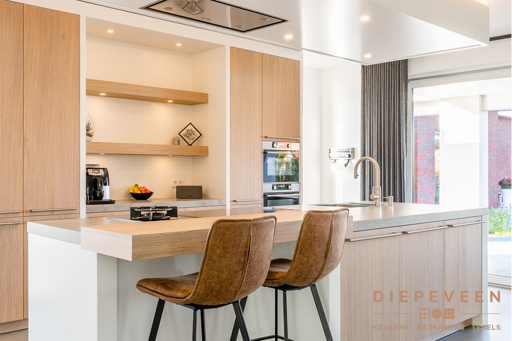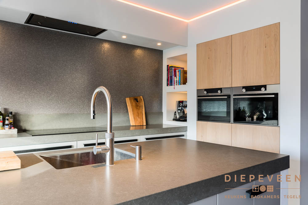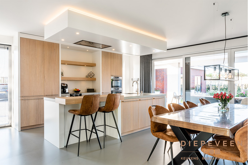 stijlvolle strakke keuken, de perfecte uitstraling in combinatie met de totale inrichting van de woning. Hoog glans wit in combinatie met eikenhout.