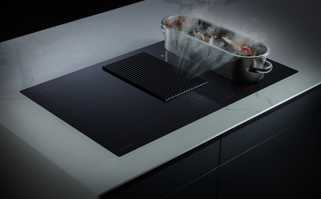 Naast de Infinite Line ovens introduceert Samsung een kookplaat met geïntegreerde afzuiging, die lucht op effectieve wijze filtert. De geïntegreerde afzuigkap ventileert de keukenruimte op efficiënte wijze: de afvoer in het midden van de kookplaat filtert geurtjes en dampen met een krachtige snelheid van 620 m2 / u.