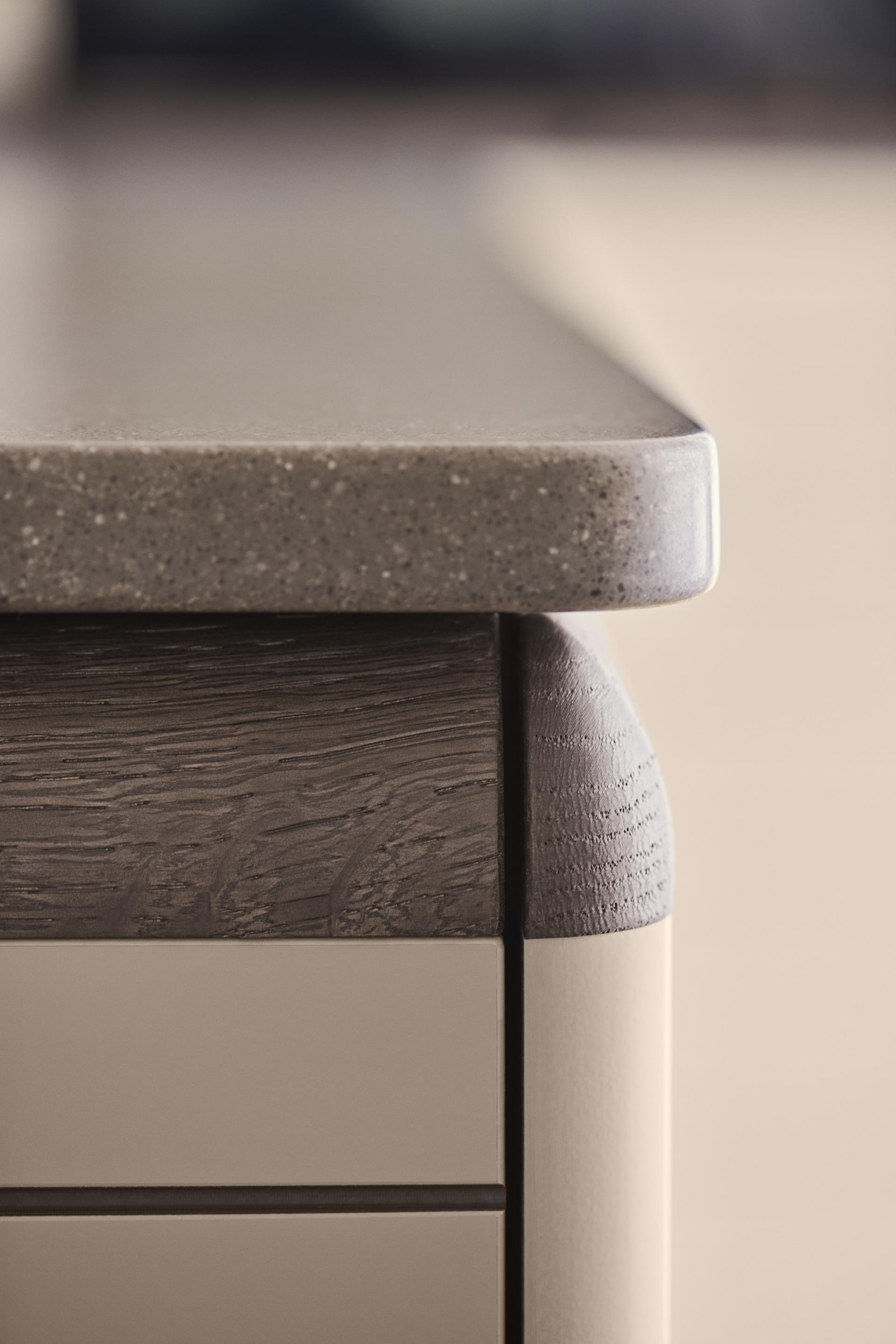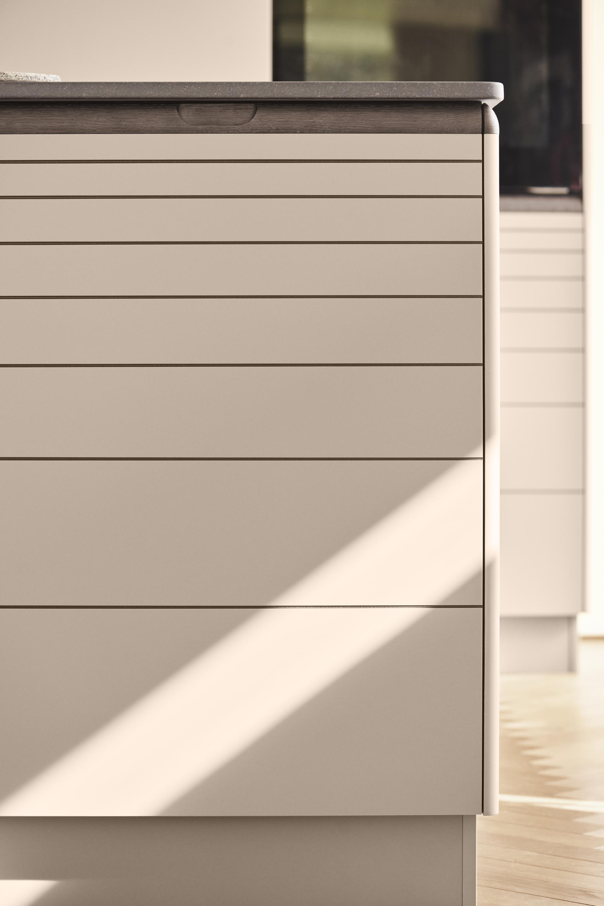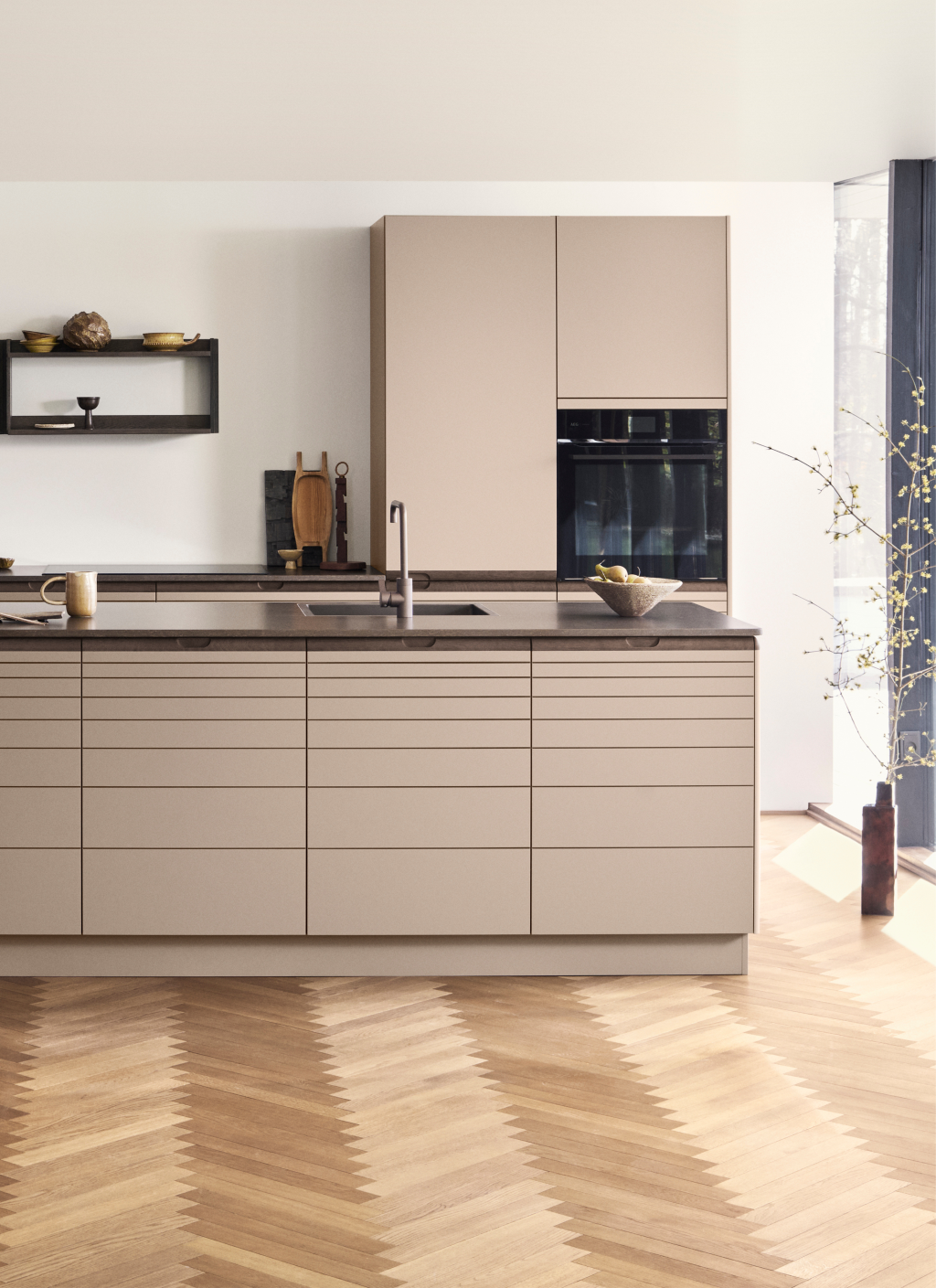 Geïnspireerd door de natuur, omarmt Align zachte lijnen, natuurlijke materialen en ronde vormen die uitnodigen tot aanraking. Elk detail draagt bij aan een gevoel van rust en harmonie: het zwevende werkblad accentueert de elegante contouren, de kleitint straalt sereniteit uit en de houten grepen voegen warmte en karakter toe. Samen vormen ze een keuken die je niet alleen ervaart met je ogen, maar met al je zintuigen.