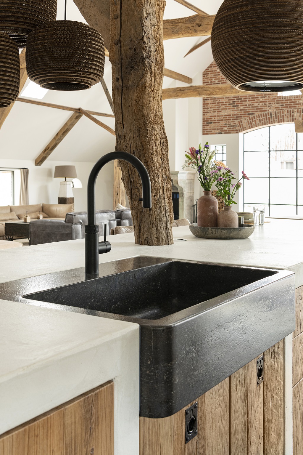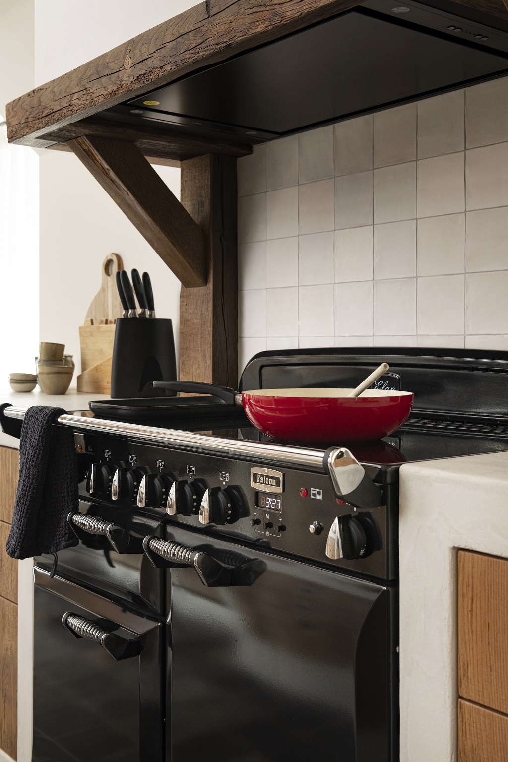Deze keuken heeft o.a. een inductie fornuis van 110 cm van het merk Falcon, een NOVY afzuigkap, een Bosch koeler, vriezer en vaatwasser