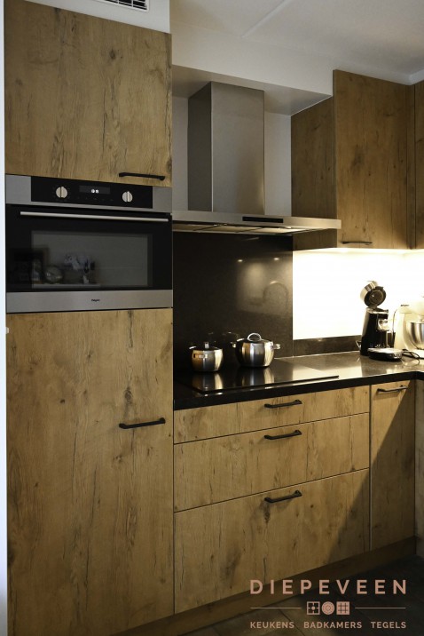 Een prachige houten keuken met zwarte accenten. Echt een keuken van deze tijd.