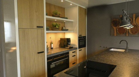 Landelijke keuken met houten front. De Novy one inductiekookplaat met geïntegreerde afzuigsysteem maakt de keuken helemaal af.