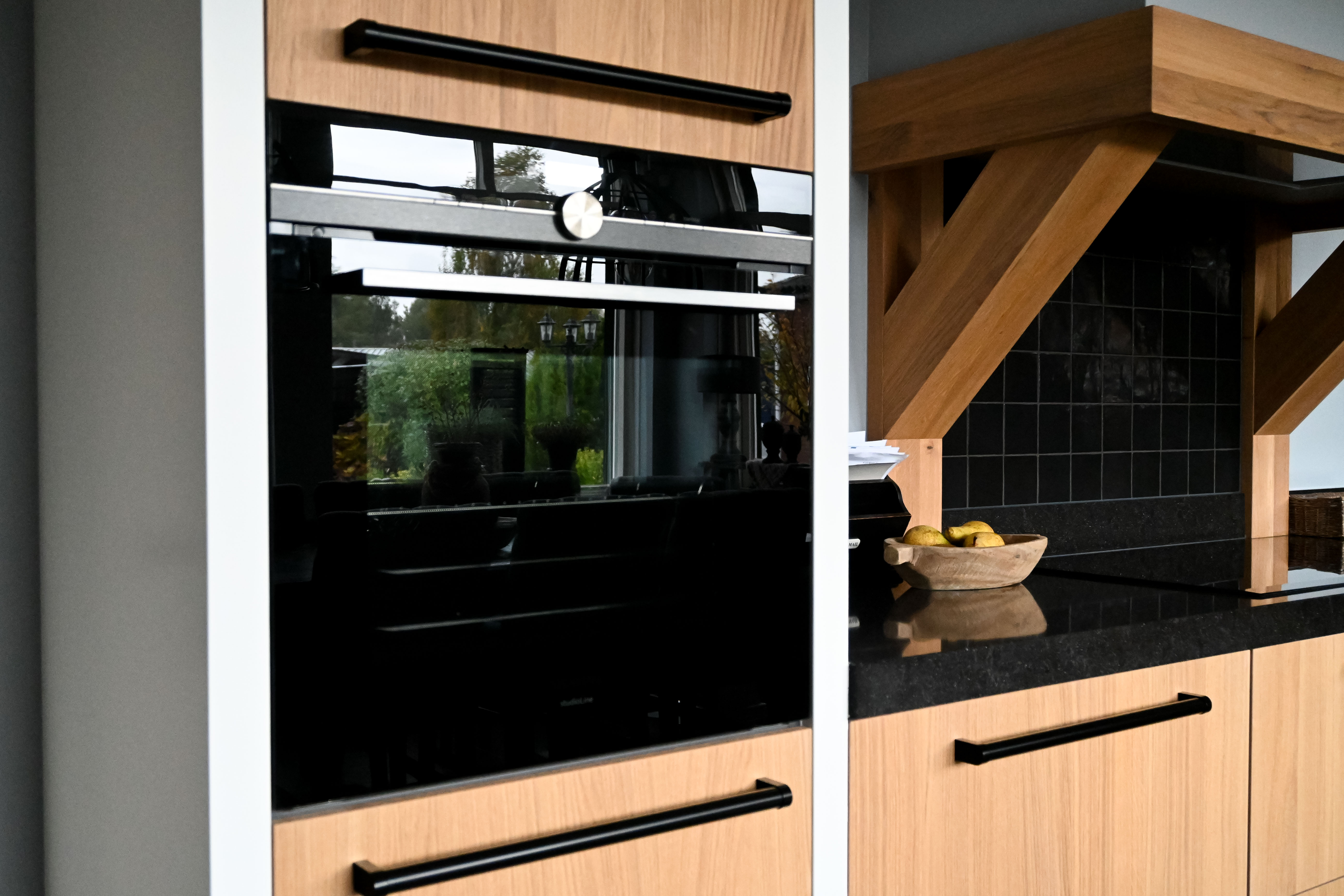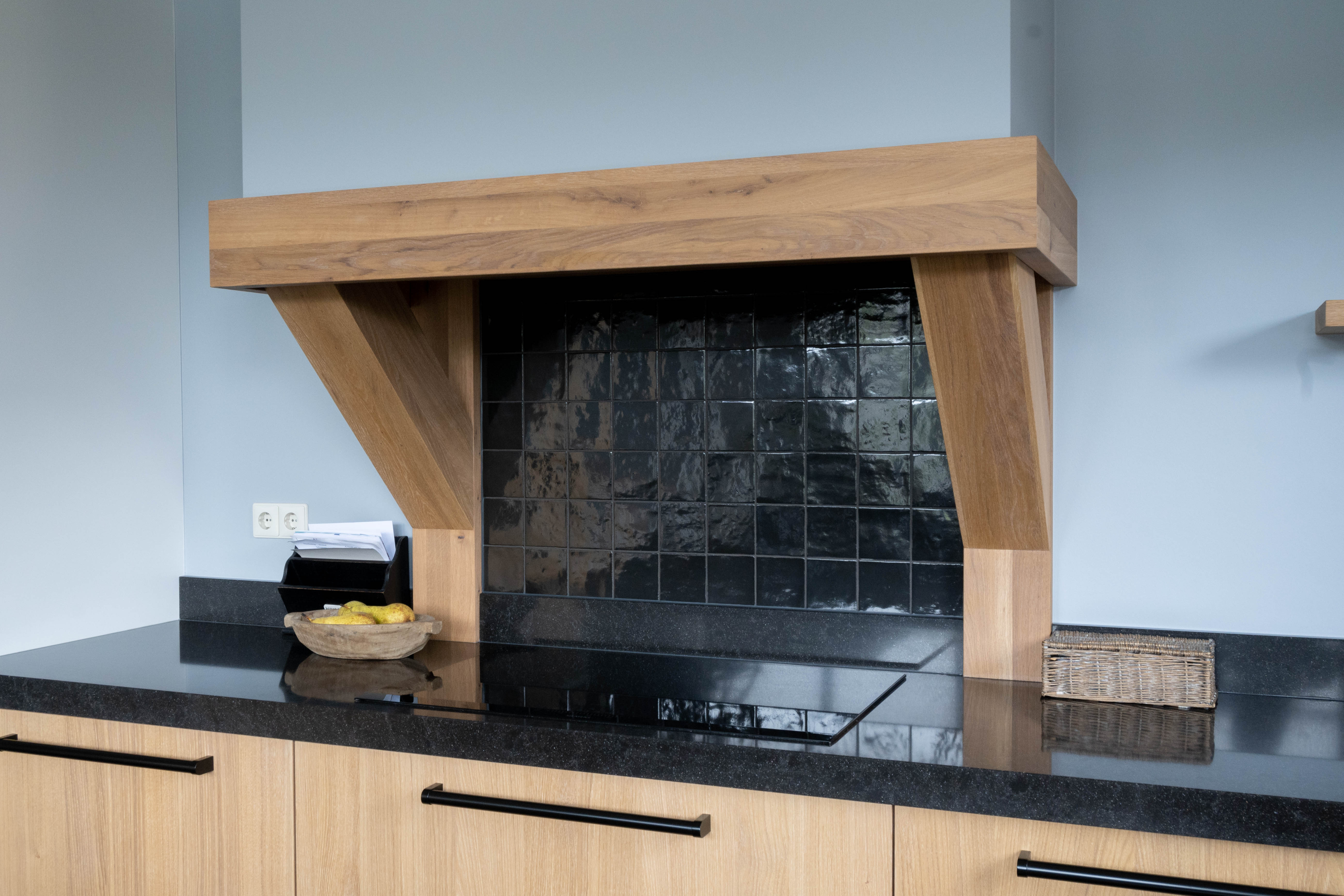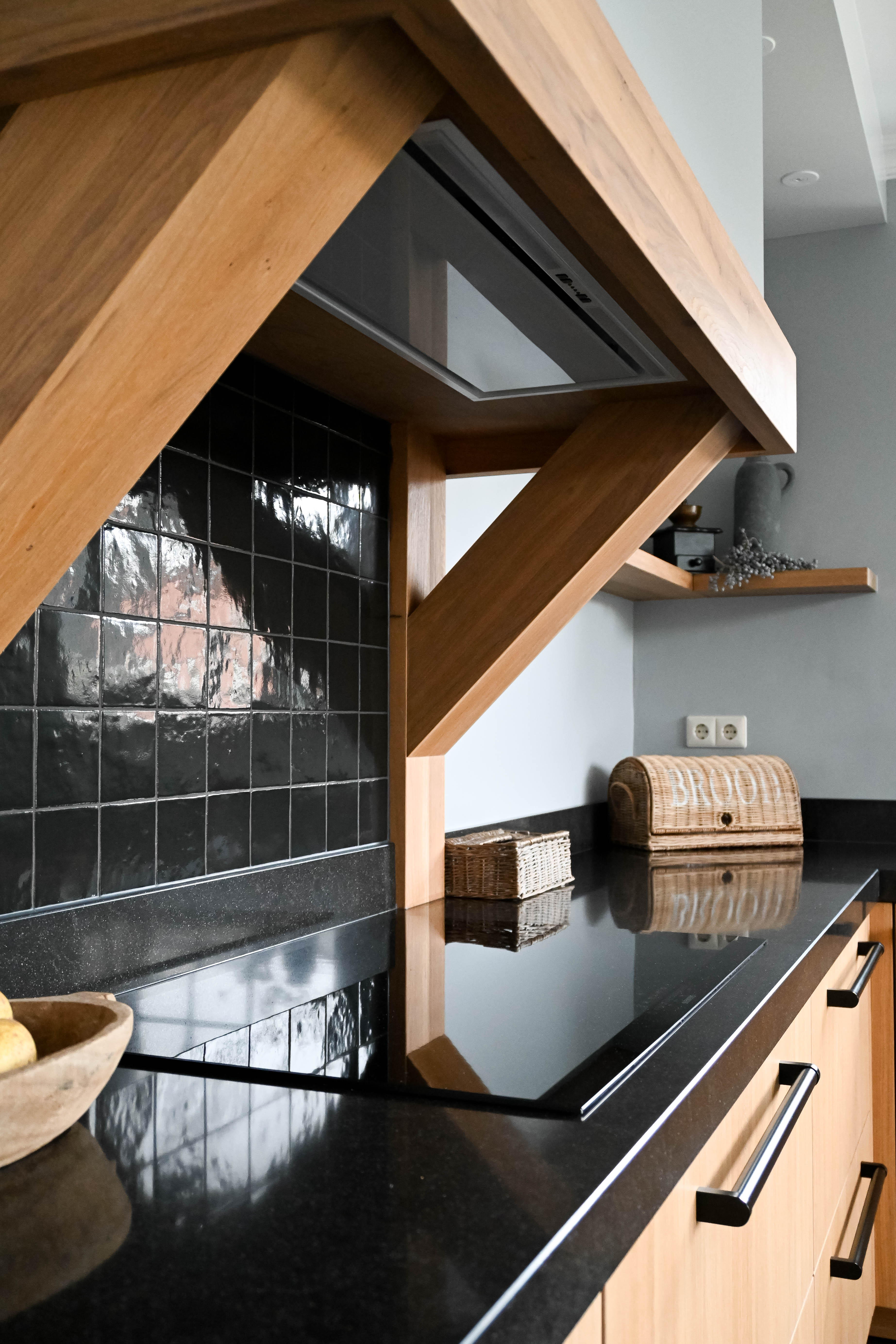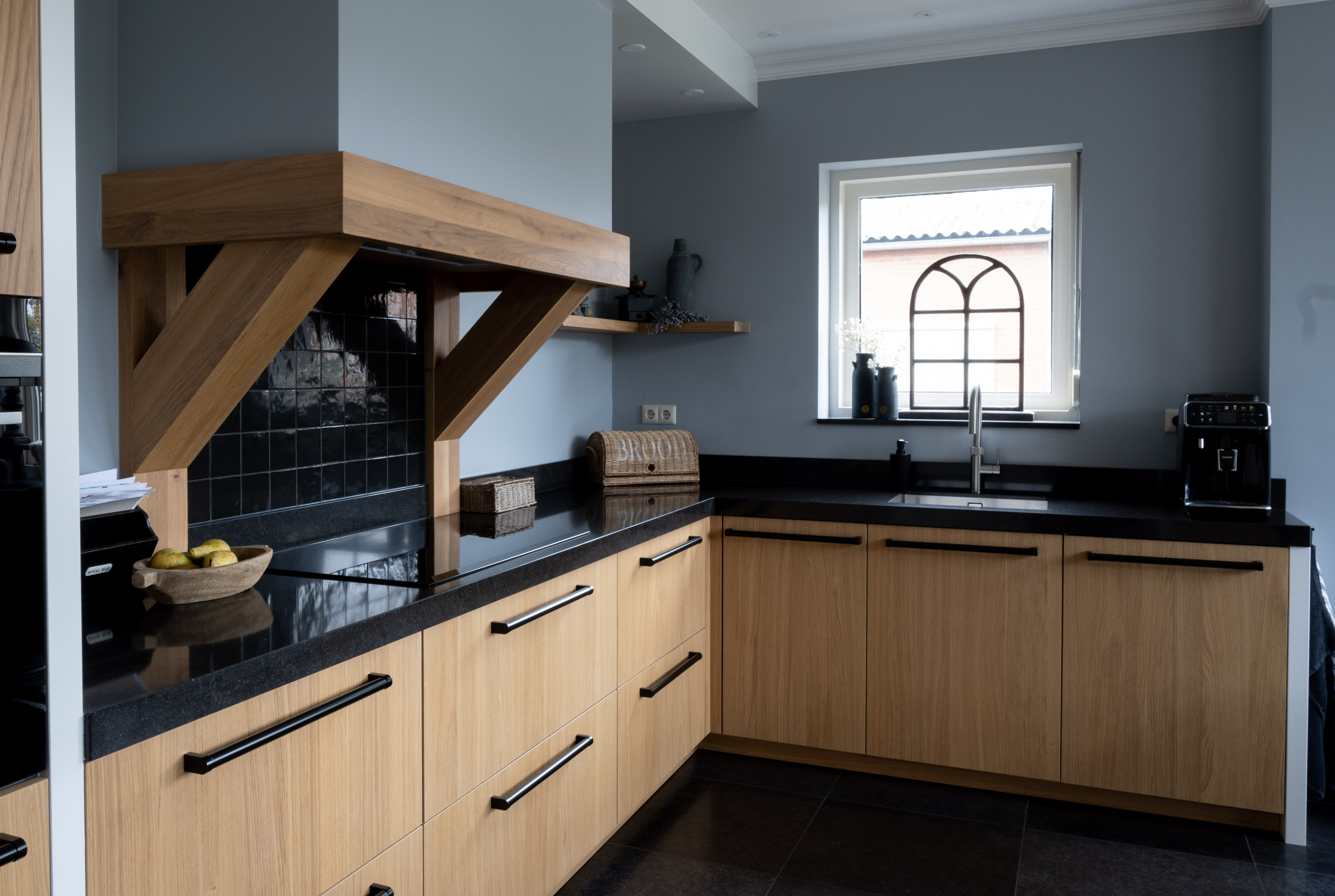 Geniet van de ruime doorloop en de opbergruimte in deze landelijke keuken. De kolossale schouw benadrukt de landelijke sfeer waarbij de strakke fronten en zwarte lange grepen voor een moderne twist zorgen. Al met al een sfeervolle woonkeuken!