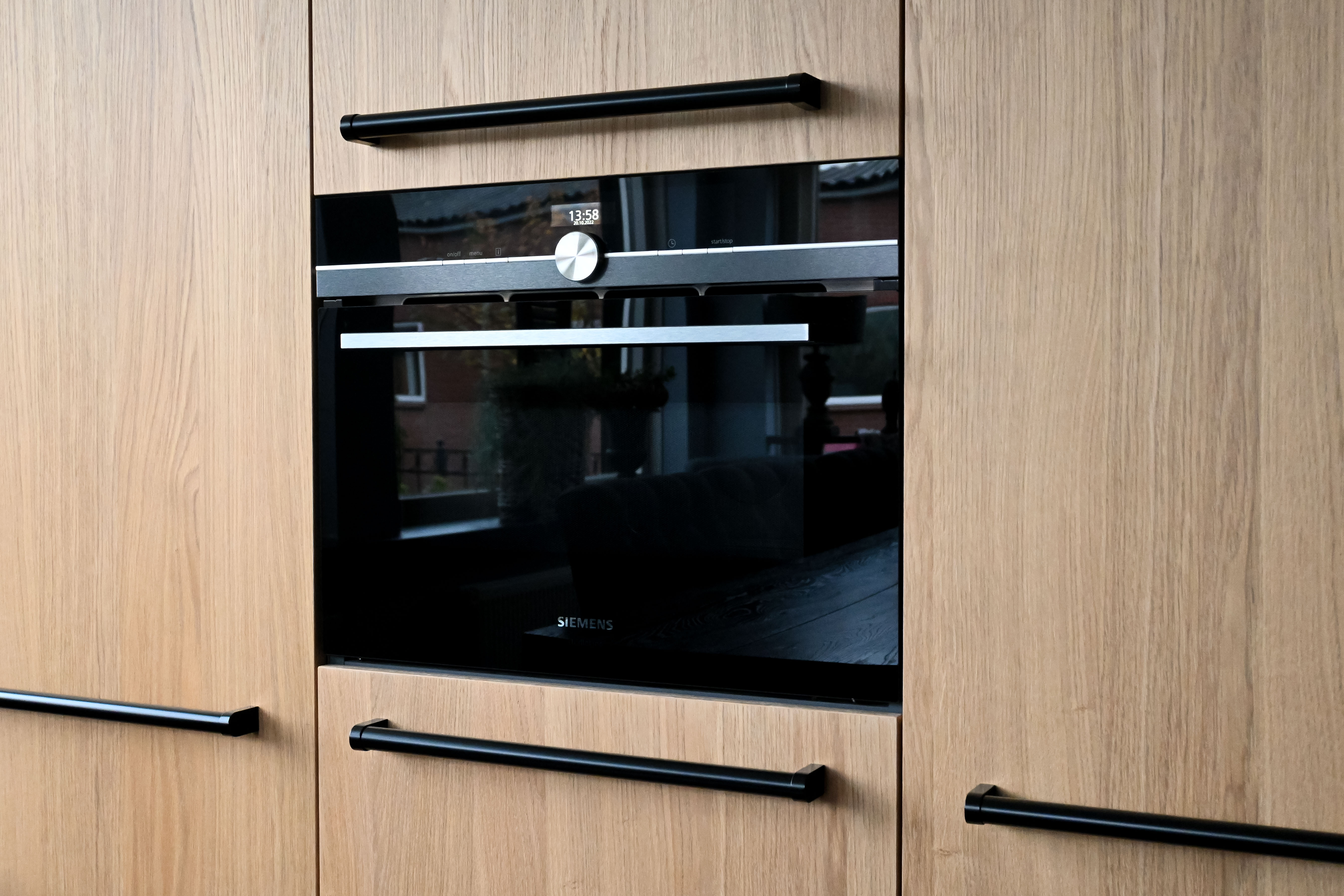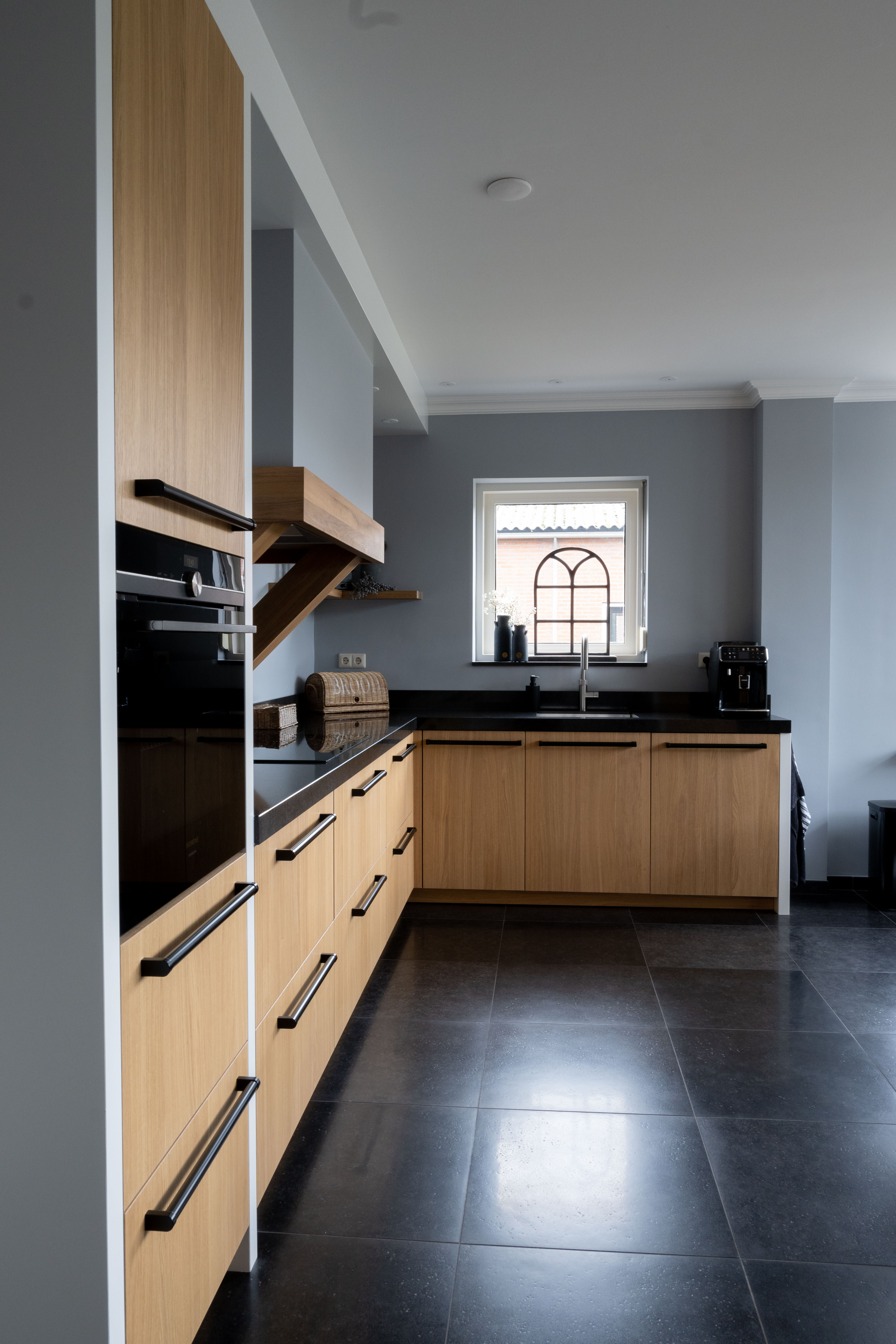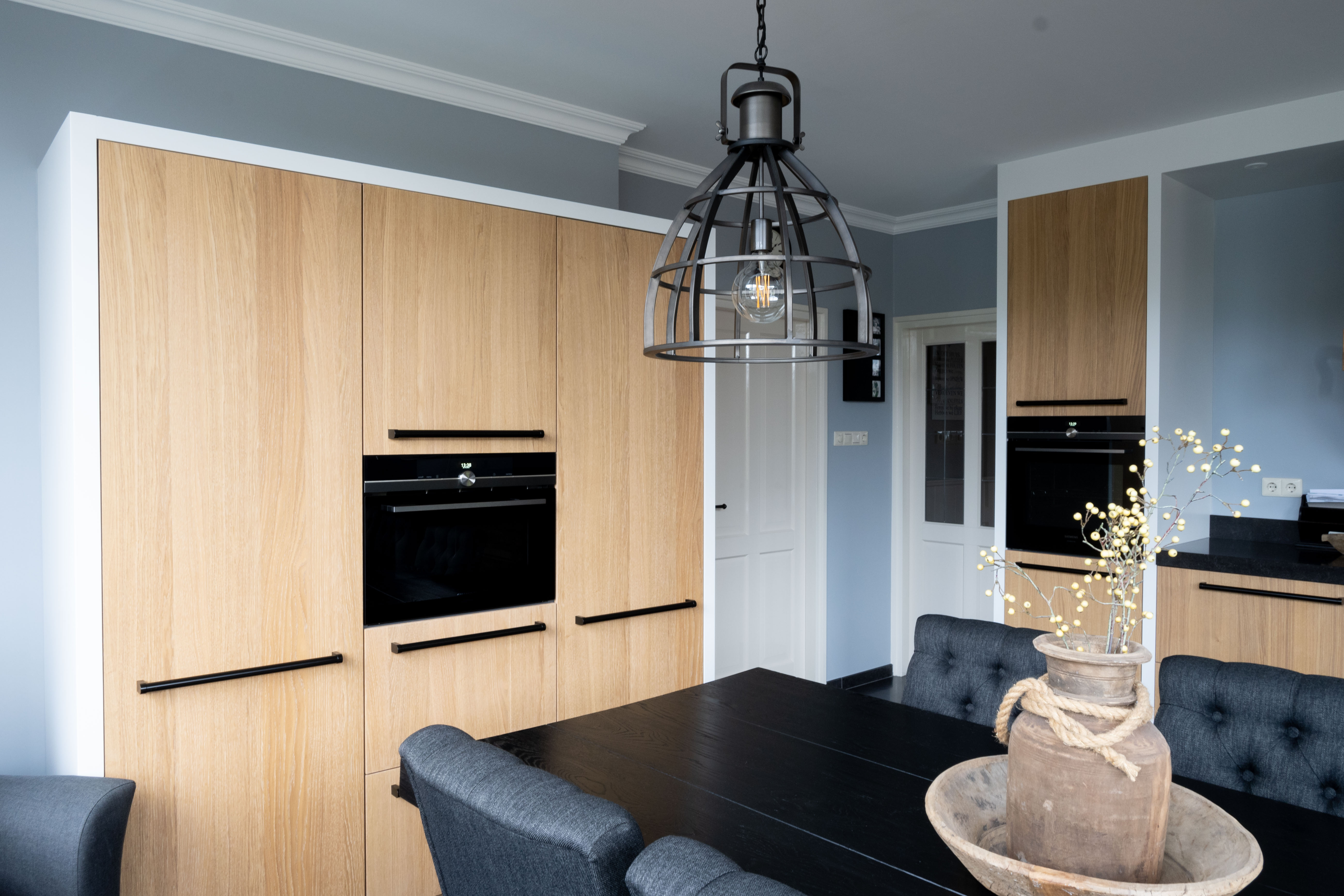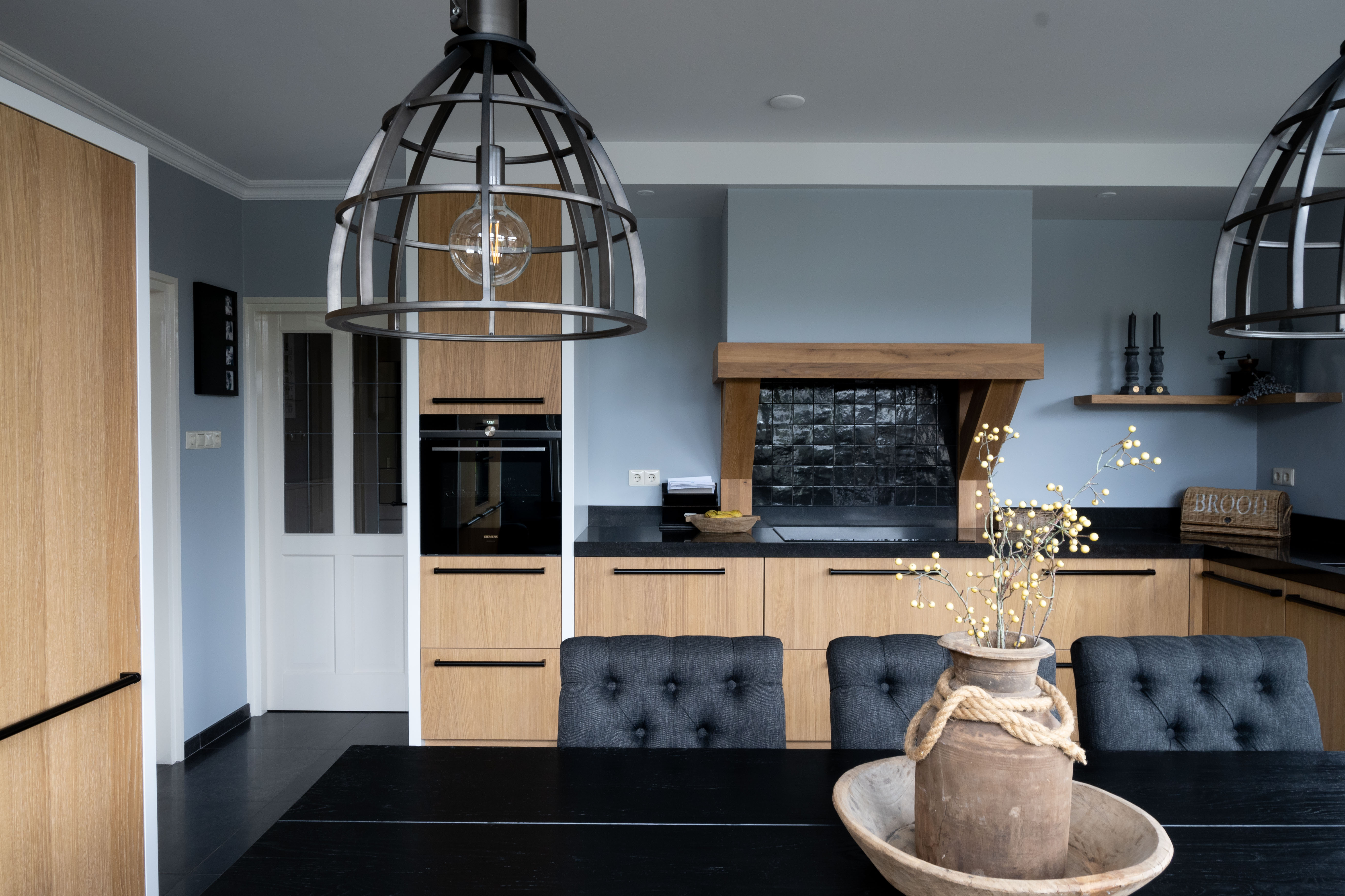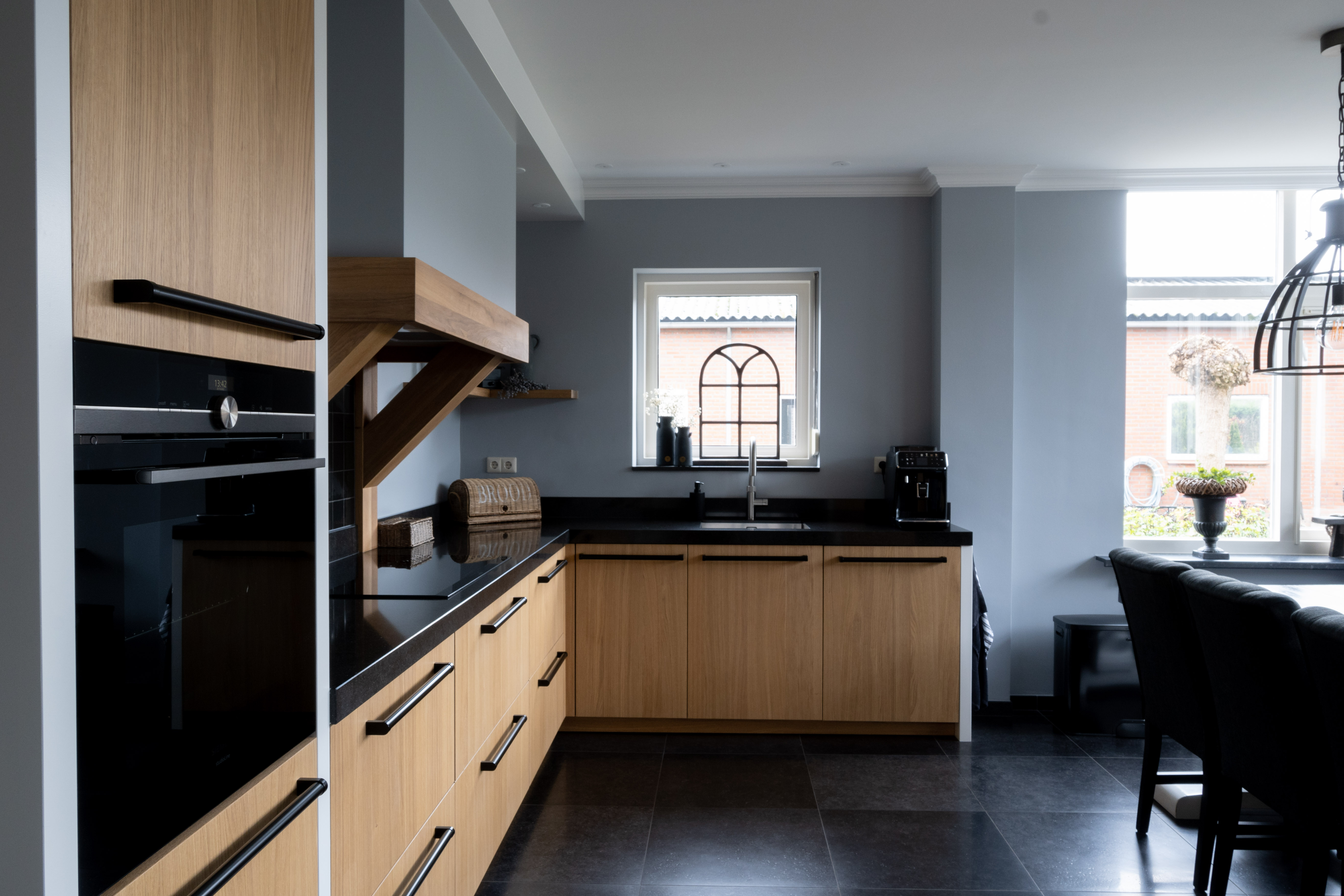 Geniet van de ruime doorloop en de opbergruimte in deze landelijke keuken. De kolossale schouw benadrukt de landelijke sfeer waarbij de strakke fronten en zwarte lange grepen voor een moderne twist zorgen. Al met al een sfeervolle woonkeuken!