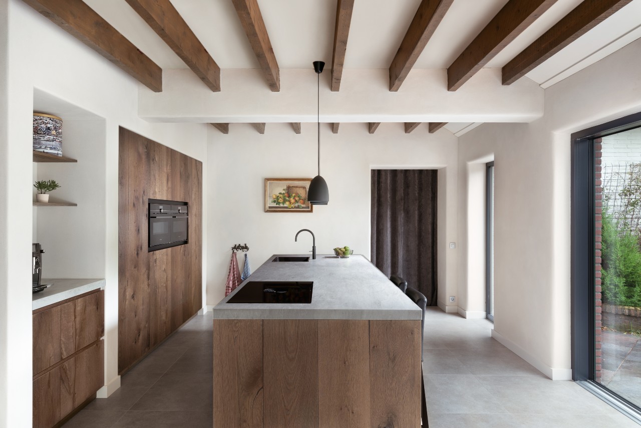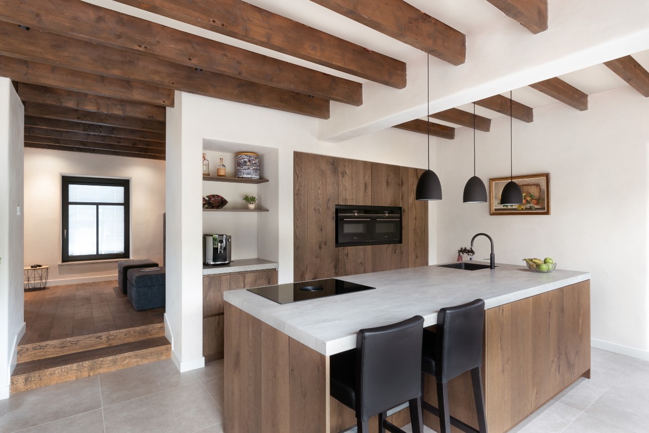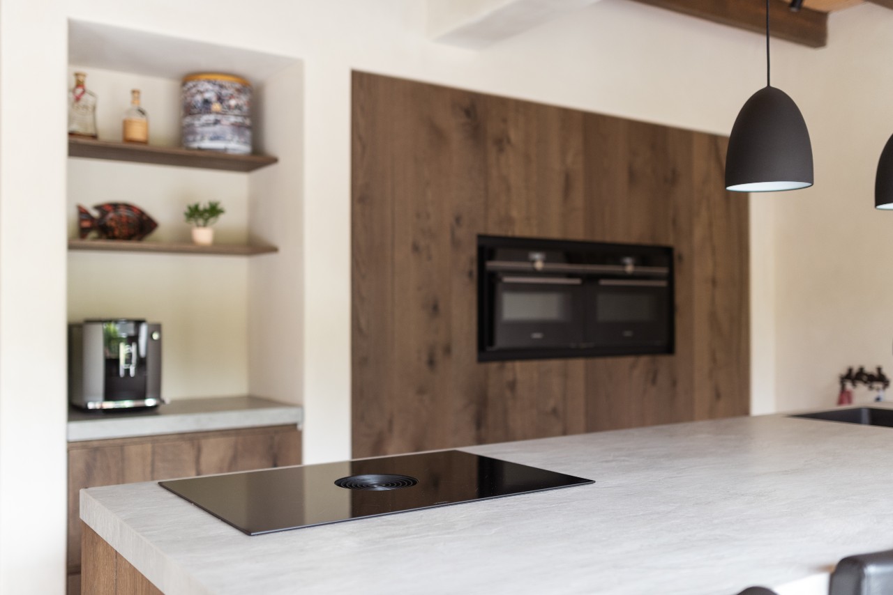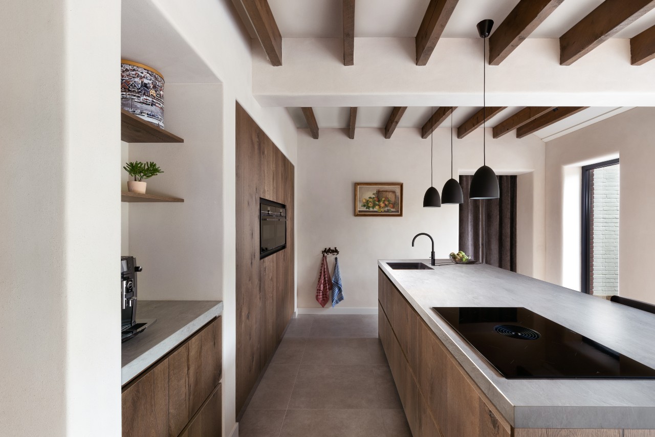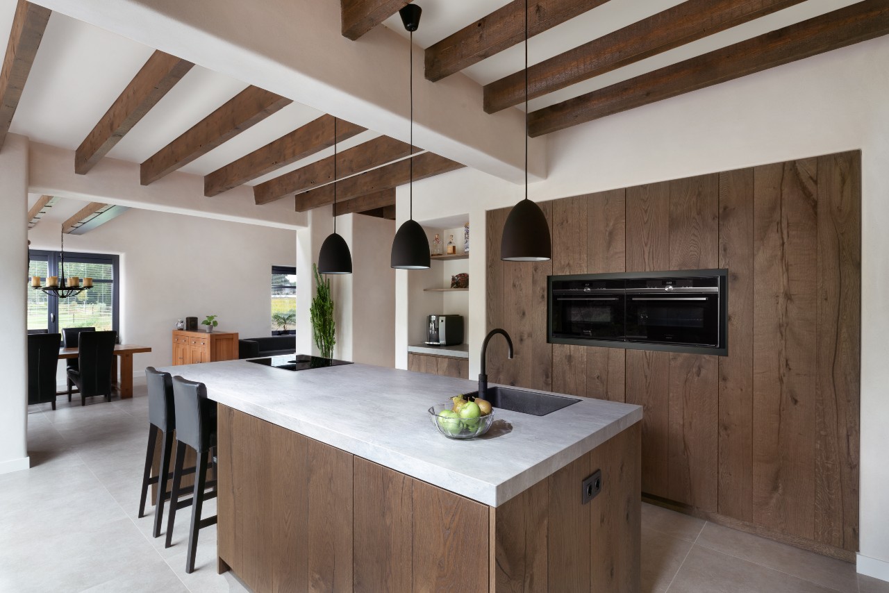 Deze landelijke keuken maakt deze woning een echt thuis. Door de landelijke keuken met Sienna fineer en noesten komt het warme uiterlijk echt naar boven.