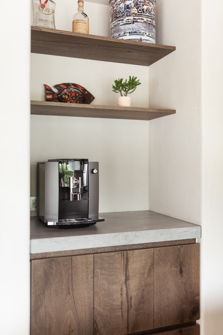 Het keramische eiland bevat een spoelgedeelte en een kookgedeelte. De combi-magnetron en de stoomoven zijn mooi in de kastenwand geplaatst. Naast de kastenwand is een nis geplaatst voor het koffiezetapparaat. Zo is er een koffiehoek gecreëerd.