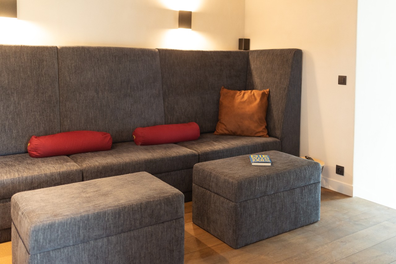 Het grote greeploze kookeiland met zitruimte maakt van deze keuken een echt leefkeuken. Voor de fronten en het kookeiland is gebruik gemaakt van genoest fineer. Het lichte werkblad met de witte stollen zorgt voor een rustige look.
