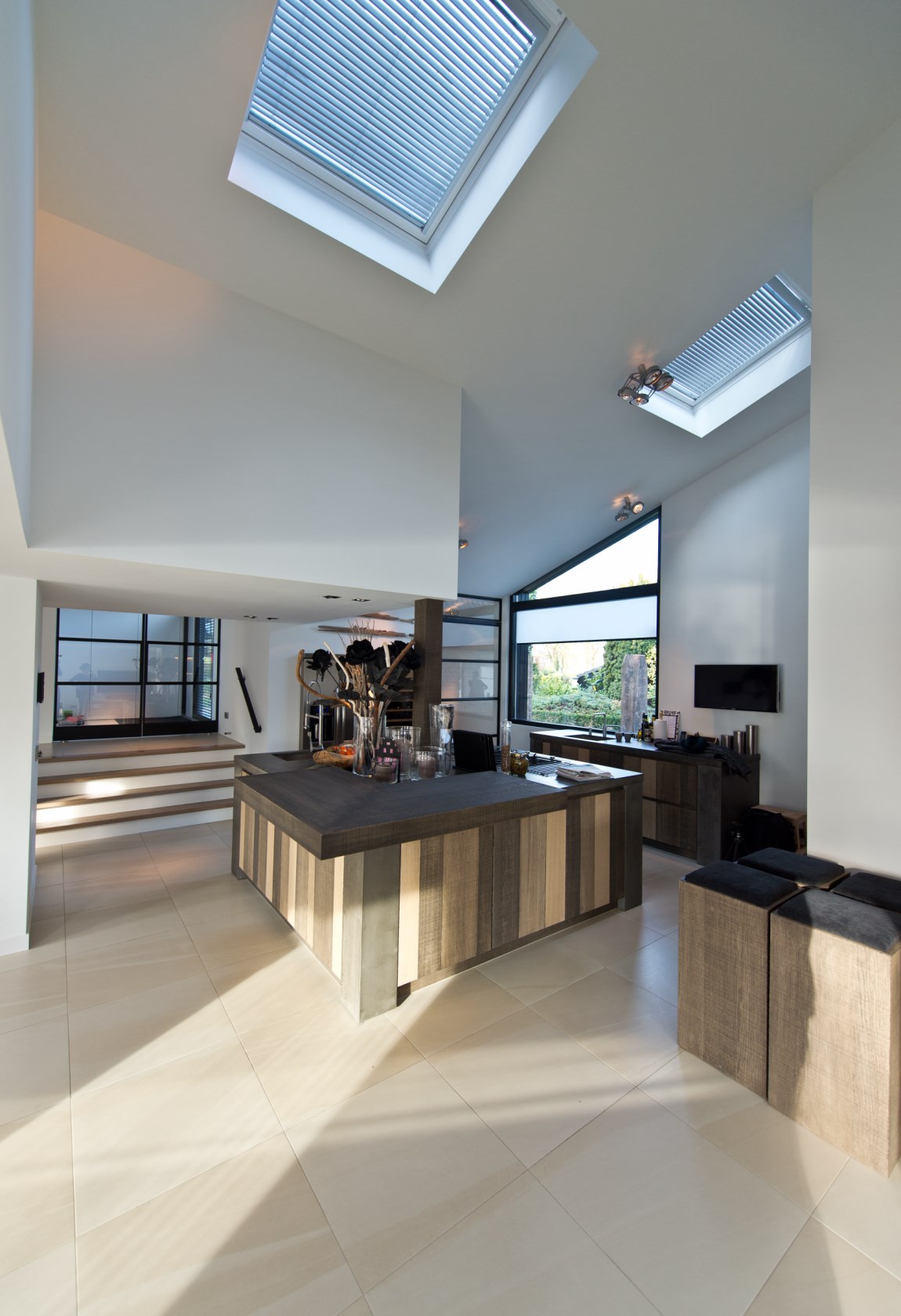 De keukendeur is van eikenhout in 3 verschillende kleuren op maat gemaakt (in vele verschillen houtsoorten verkrijgbaar). De Tieleman woonkeuken is letterlijk het natuurlijke hart van de woning. In deze woning in Brabant is te zien dat hout en strak wit design uitermate goed zijn af te stemmen.