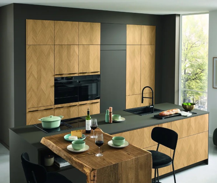 De fronten in de keuken zijn van zwart melamine met een prachtige houtnerf. Ze hebben de uitstraling van een eiken variant, maar in vergelijking is dit materiaal sterker en praktischer. De witte ‘ombouw’ in de keuken is gemaakt van MDF. Ik heb dit bewust wit gelaten zodat de keuken niet te donker wordt.