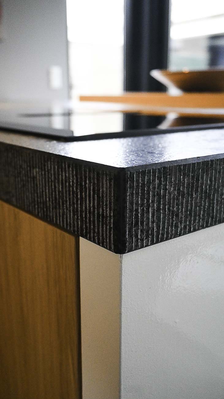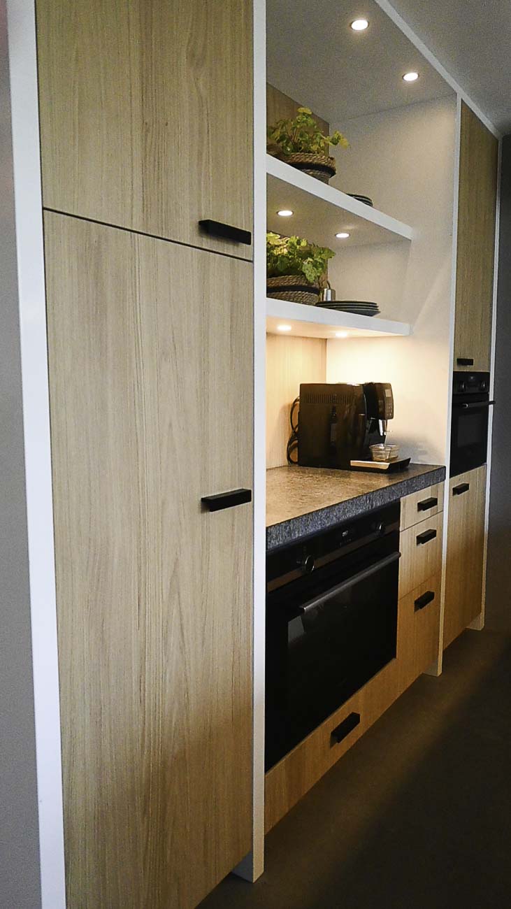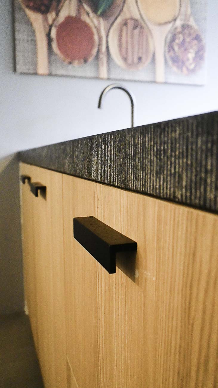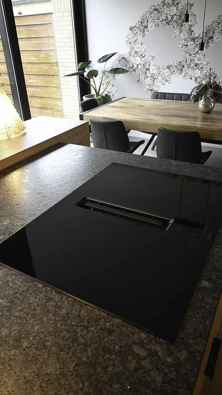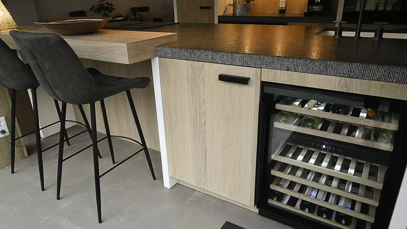 Er is gekozen voor een granieten werkblad gecombineerd met eiken fronten en zwarte grepen. Een fijne leefkeuken.