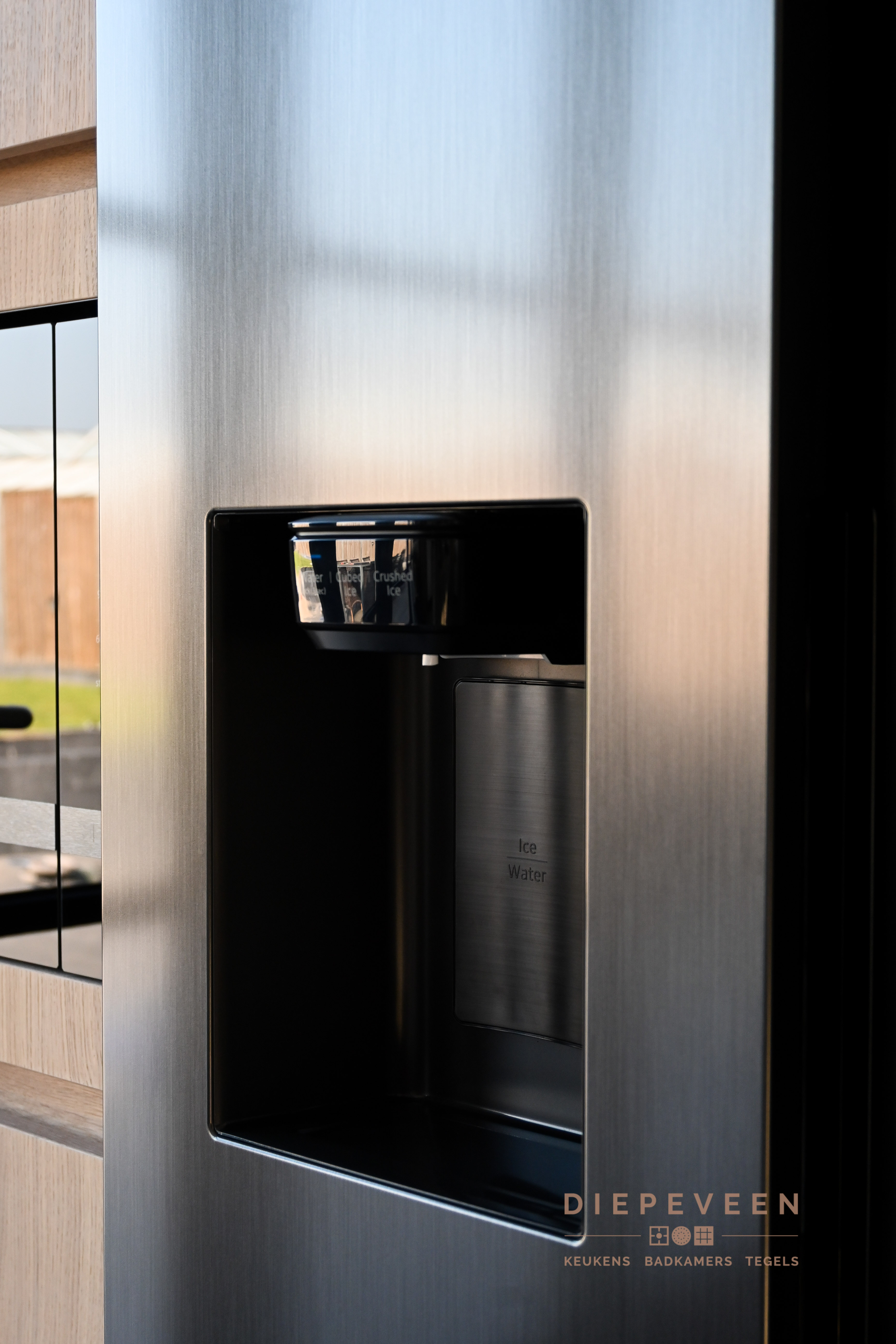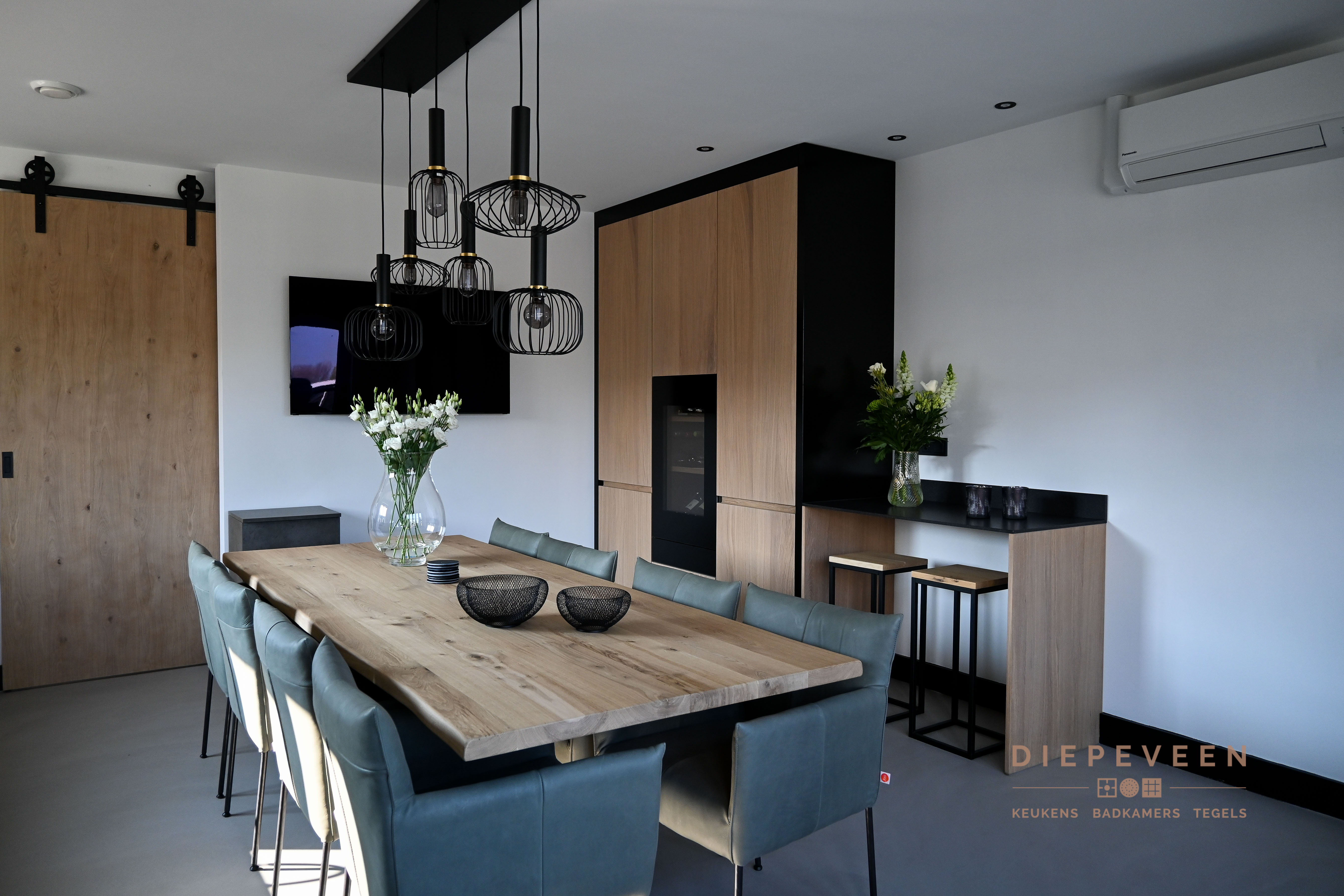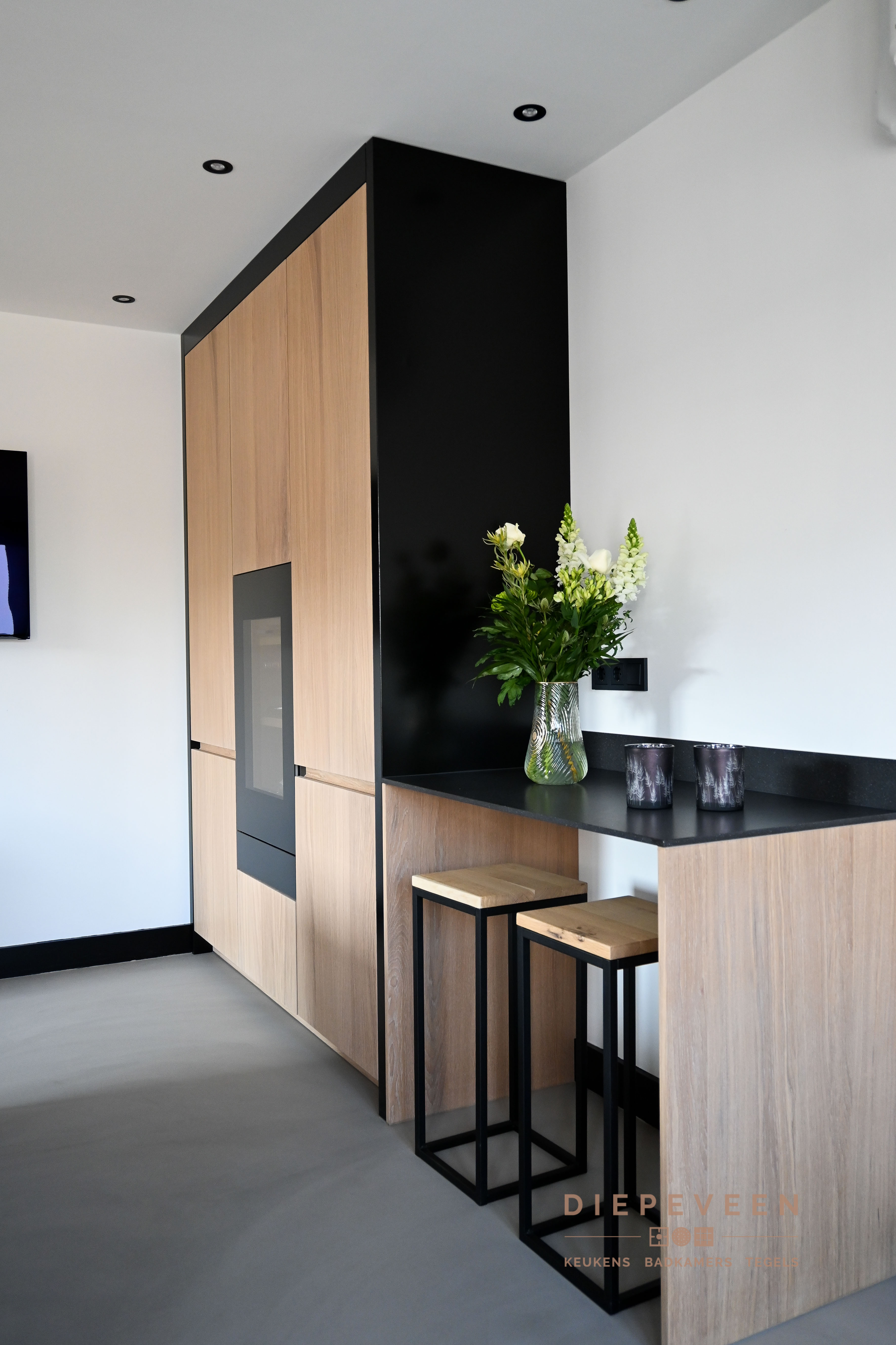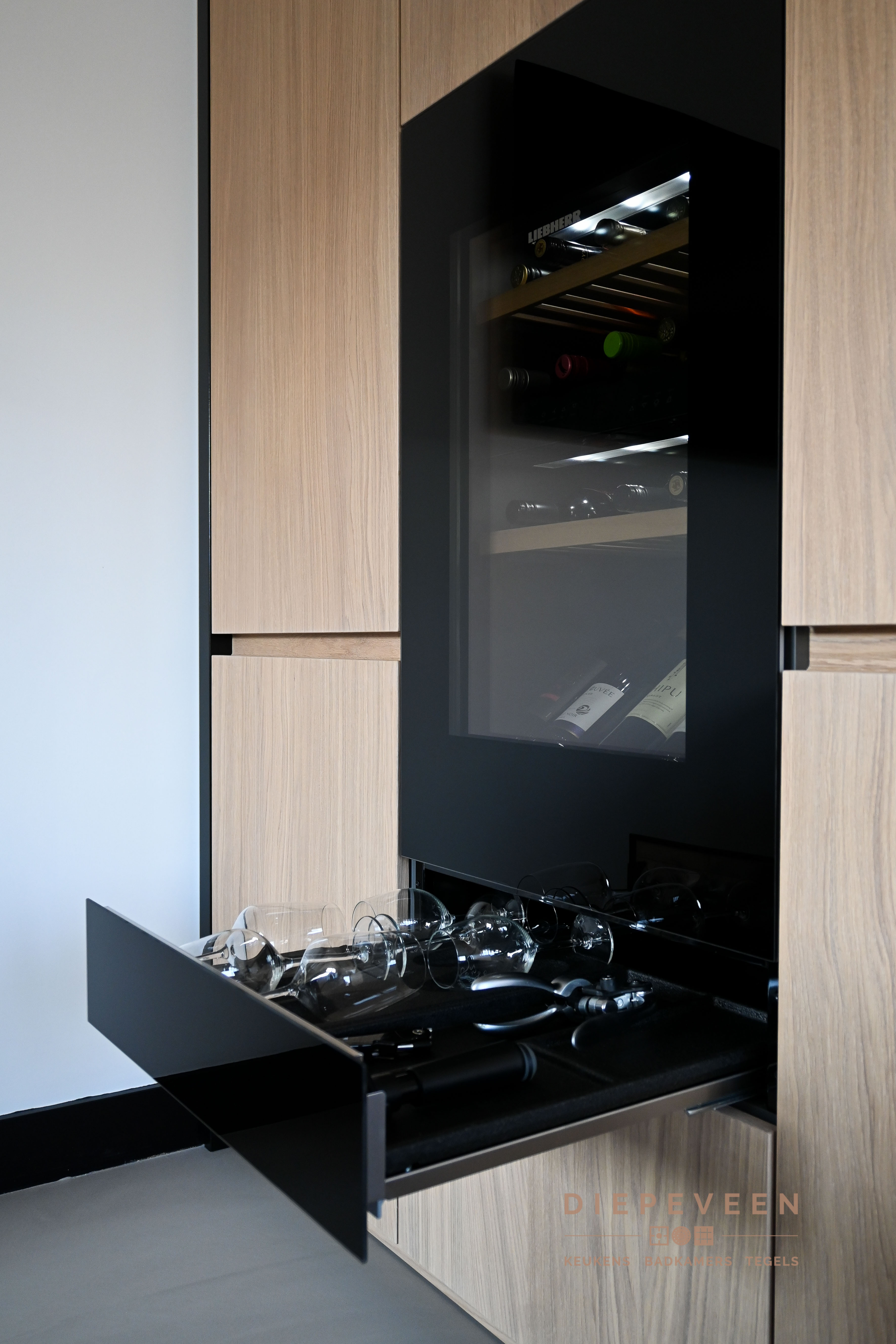 Ijsklontjes, Koud water, Koude wijn, en een zee van ruimte. Alles is te vinden in deze prachtige keuken! Onder de wijnklimaatkoelkast zit zelf een la voor de wijnglazen! En dit alles zit verpakt in de prachtige kleurencombinatie van zwart met licht hout. Alles in stijl!