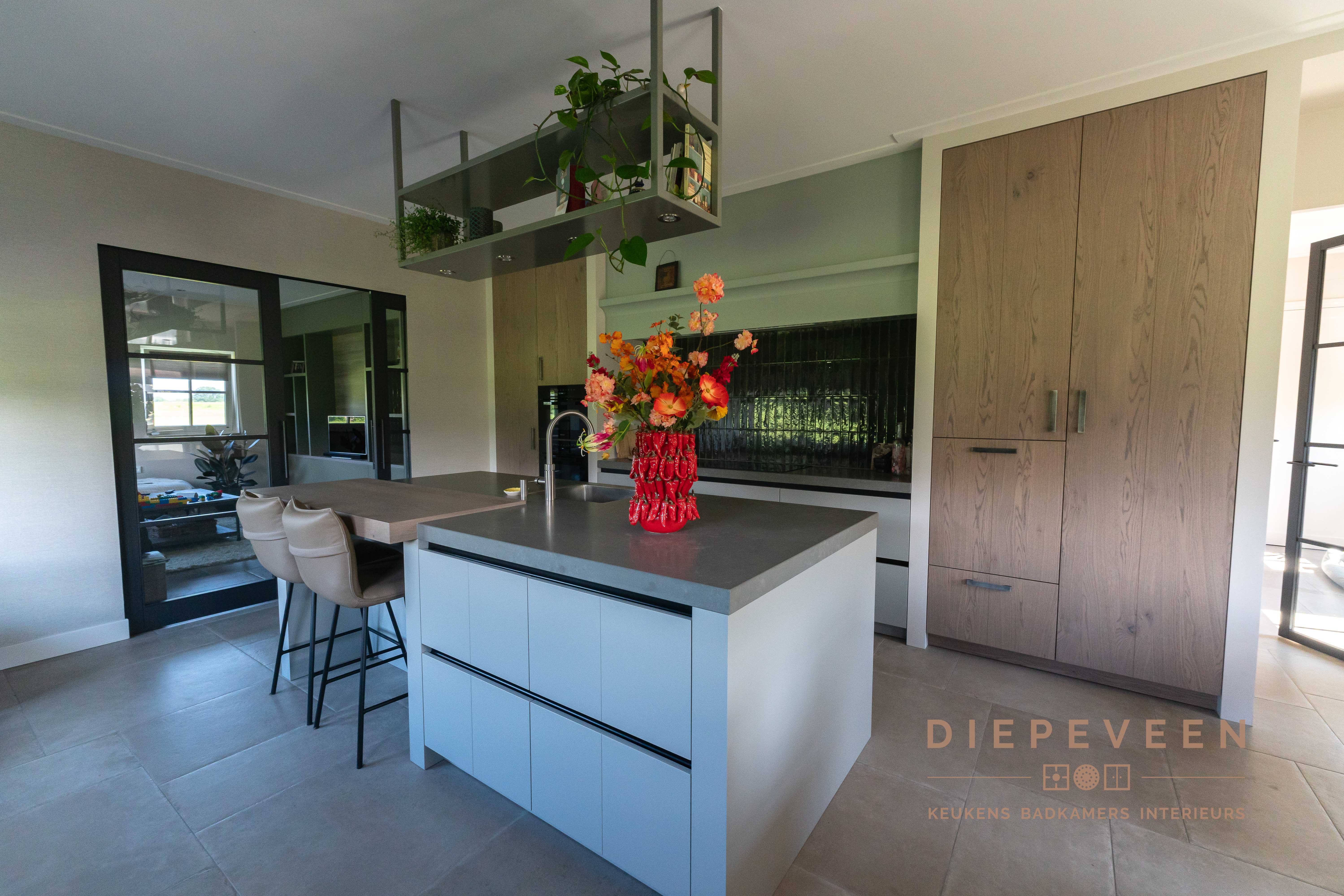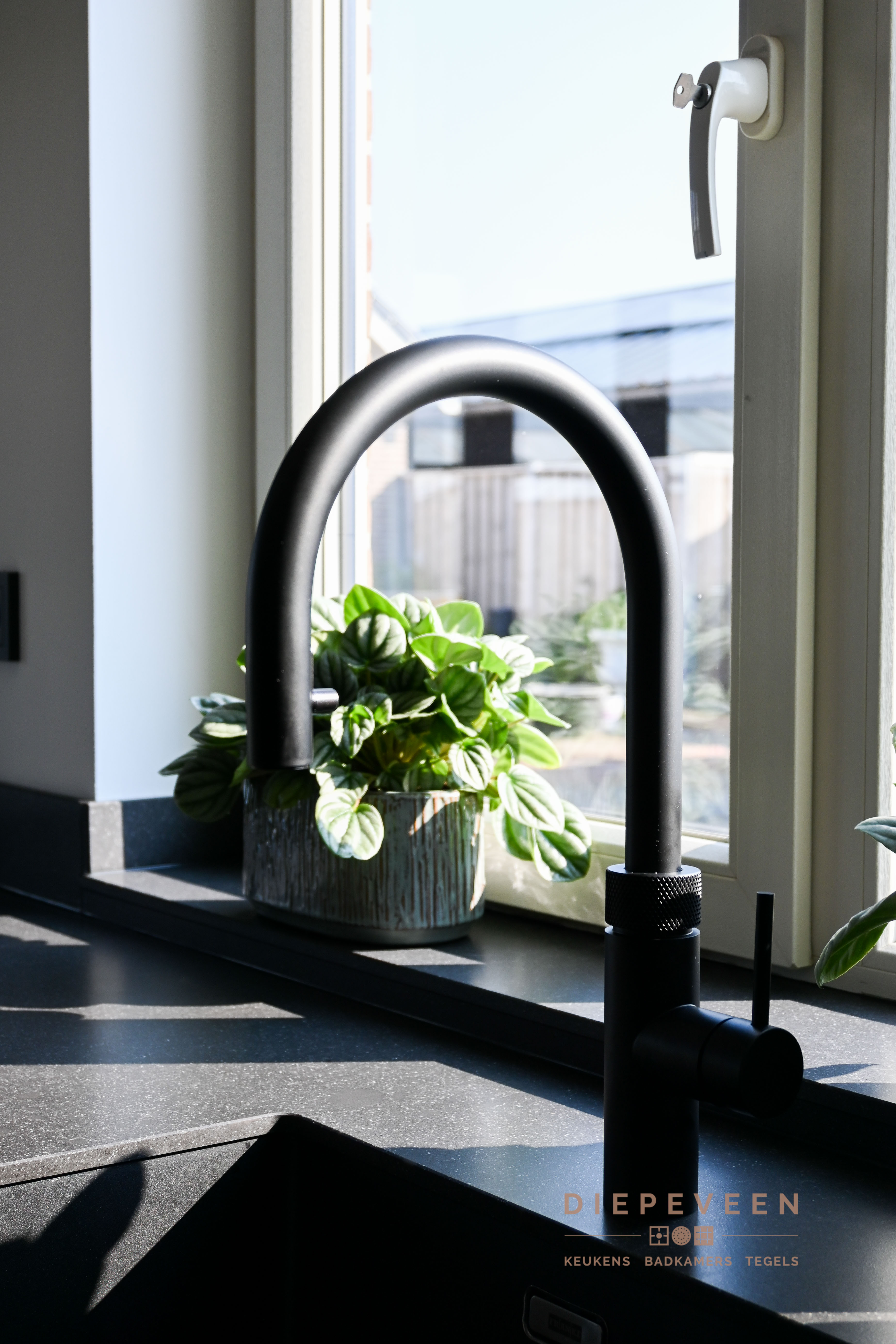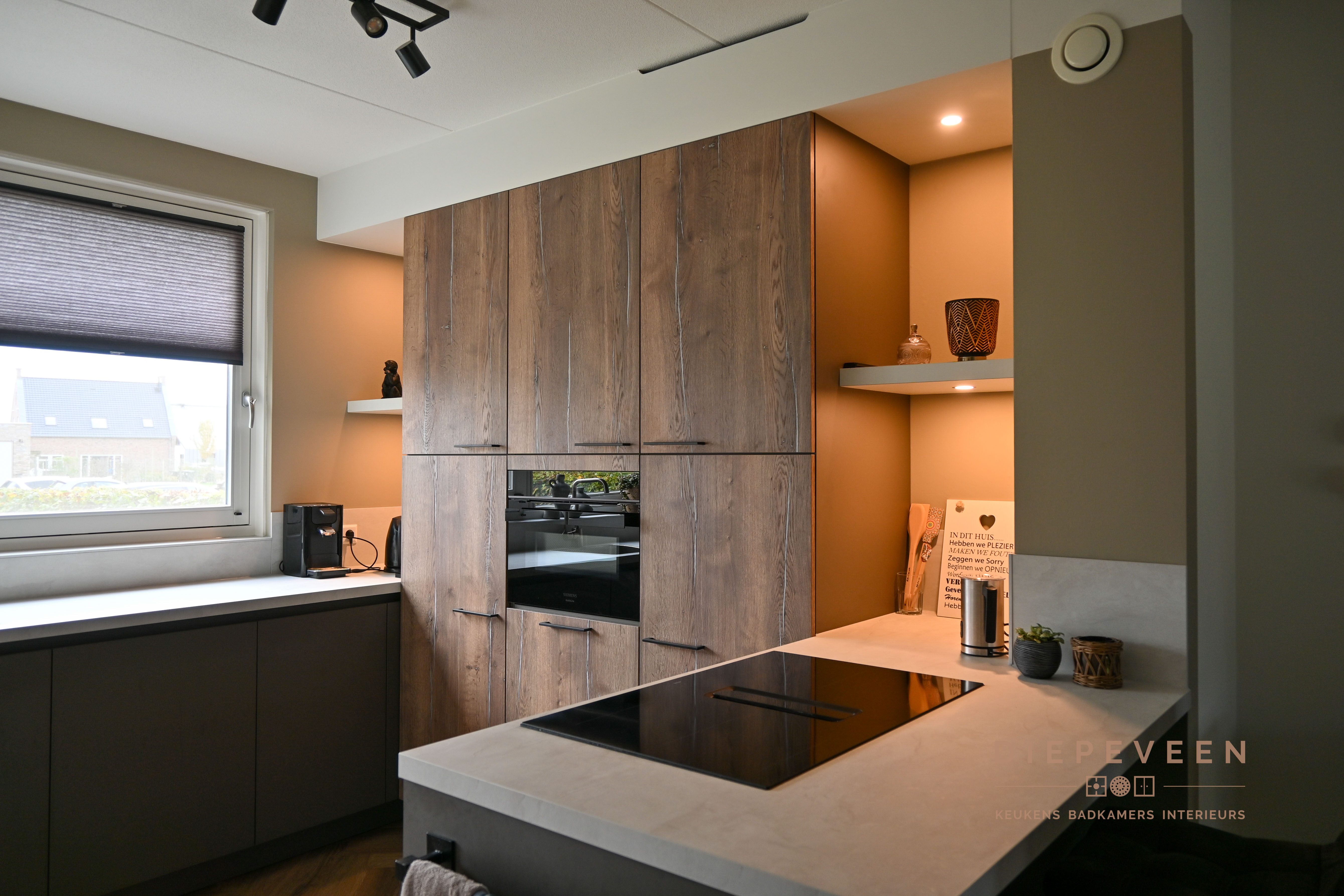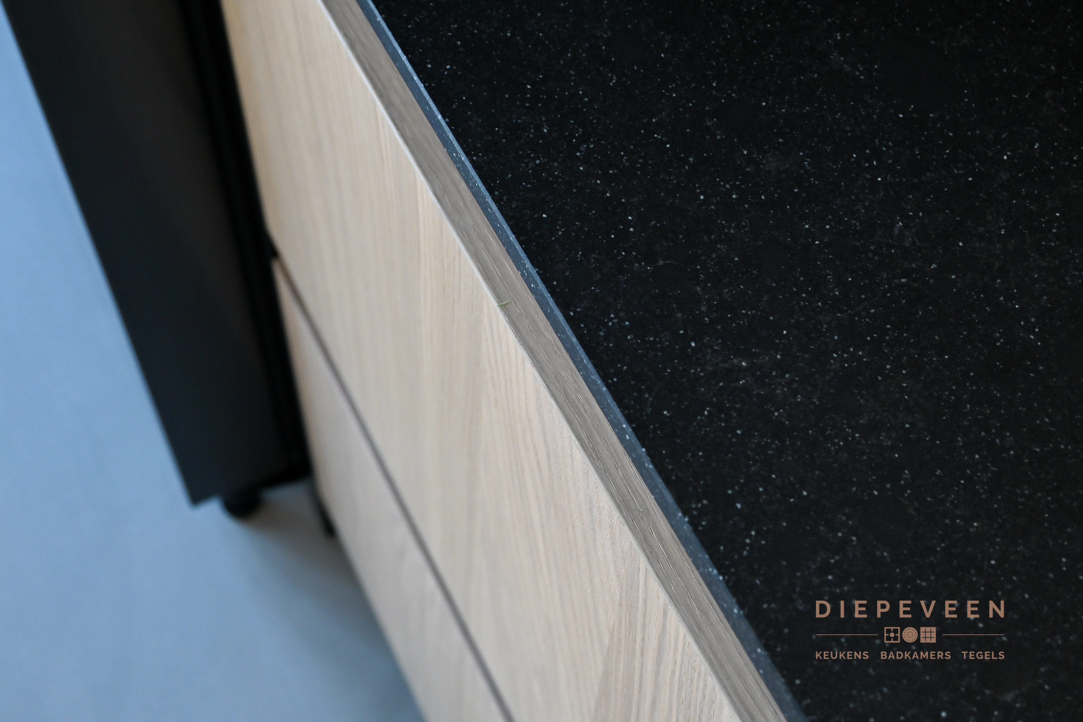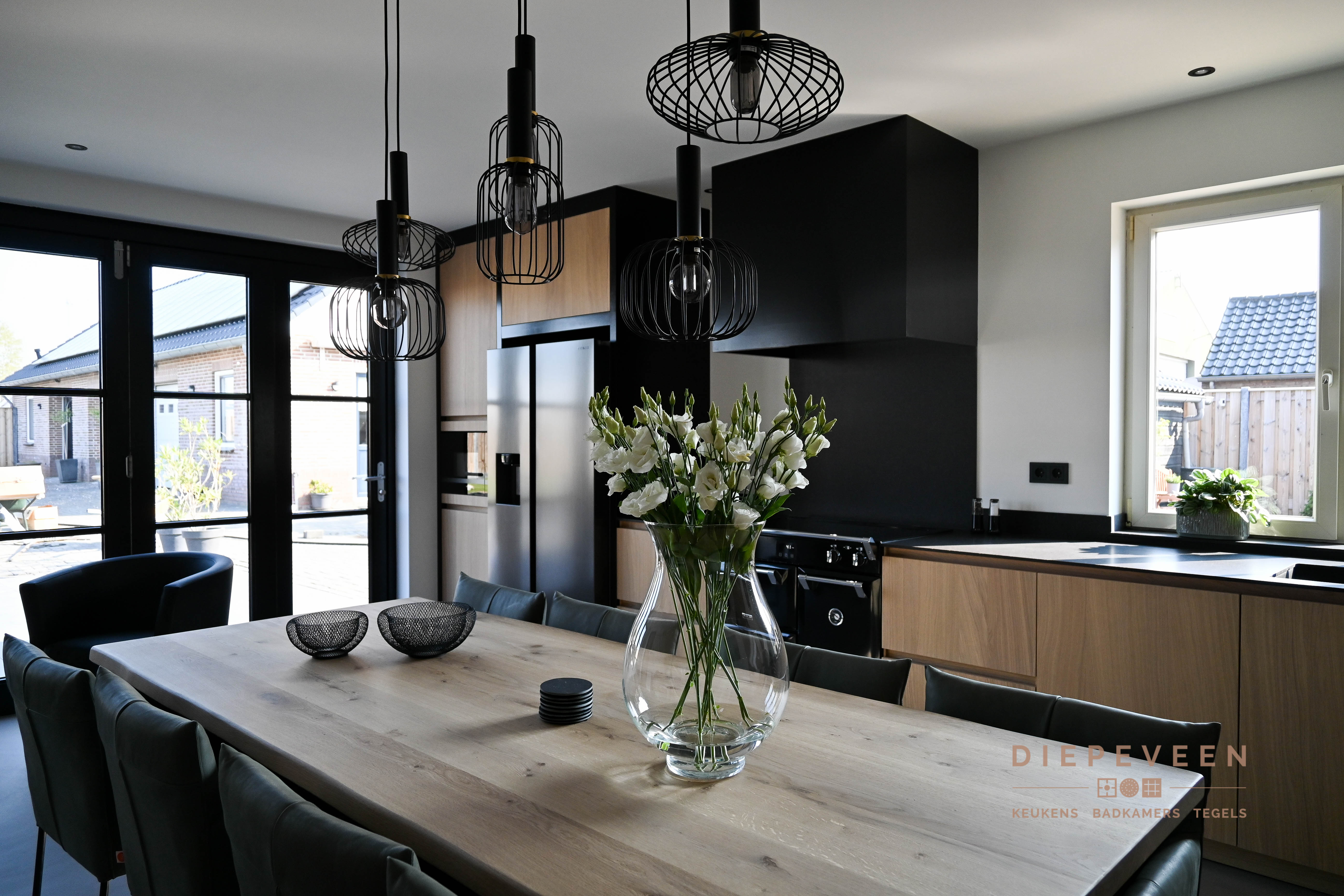 Ijsklontjes, Koud water, Koude wijn, en een zee van ruimte. Alles is te vinden in deze prachtige keuken! Onder de wijnklimaatkoelkast zit zelf een la voor de wijnglazen! En dit alles zit verpakt in de prachtige kleurencombinatie van zwart met licht hout. Alles in stijl!