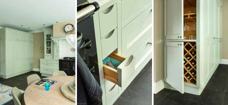 Voor het gezin maakte Windsor Bathrooms ook de badkamers, de inbouwkasten en een schouw in de keuken. In de schouwkolommen werden nog eens kastjes gemaakt. Een hoge kast staat op de grens van keuken en woonkamer. Ee-n bij zondere kast die aan de lange kant uit apothekerskasten en een koel- en vrieskast bestaat. Op de kopse kant blijkt er nog wijnkast beneden te zijn, en een wijnrek met glazen erboven. Eigenaar Lammert van de Vegt: “Door de kast krijgt het huis een logische en prettige loop. Als je in de woonkamer zit, pak je gewoon een glaasje wijn uit de kast, zonder dat je weer door de keuken moet. Alles is lekker vlakbij. Het zijn dit soort niet-gestandaardiseerde oplossingen die onze keukens heel persoonlijk maken.”